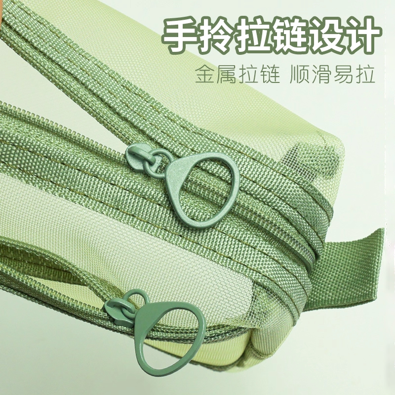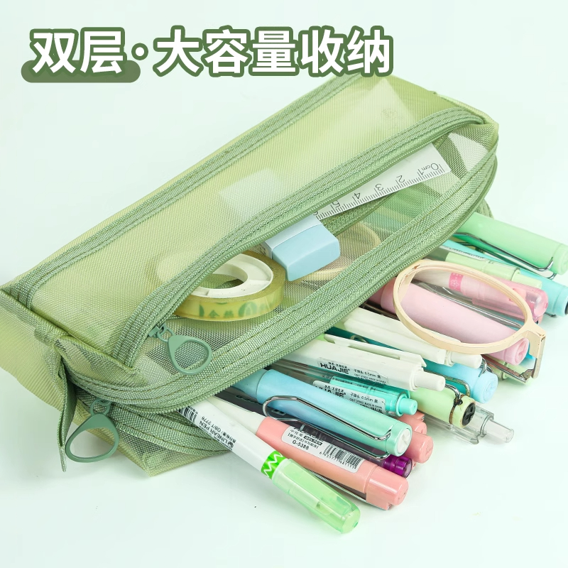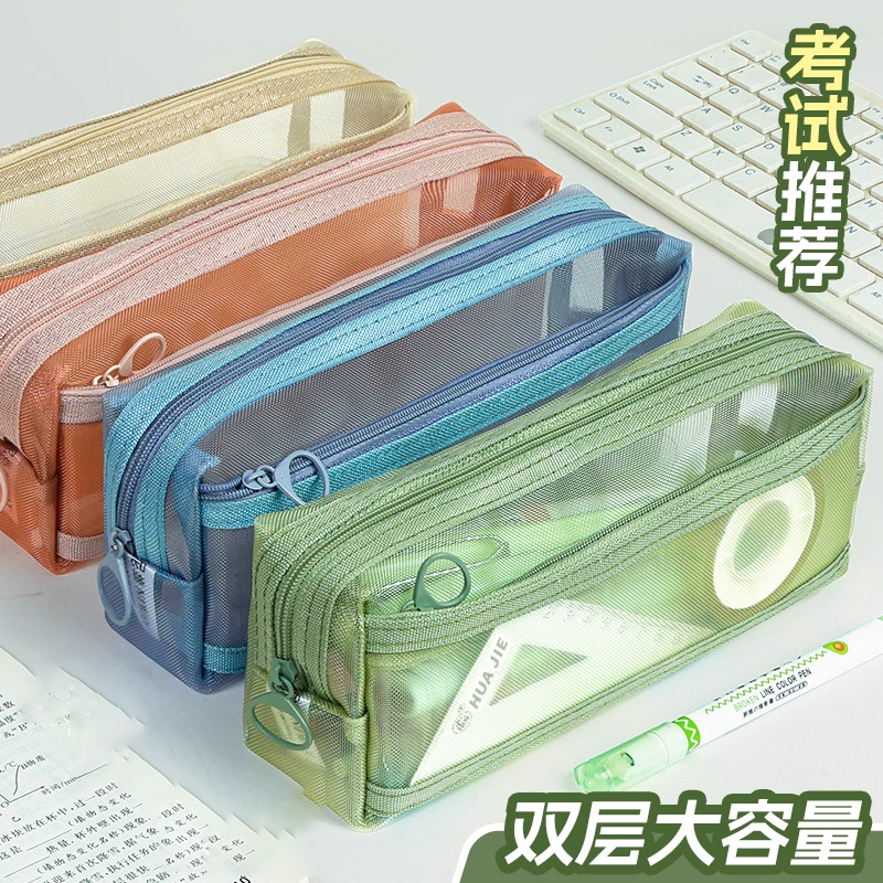 透明笔袋双层网纱文具袋学生考试大容量文具盒儿童铅笔袋男女孩款新款高颜值便携简约收纳袋蓝色绿色立体可放