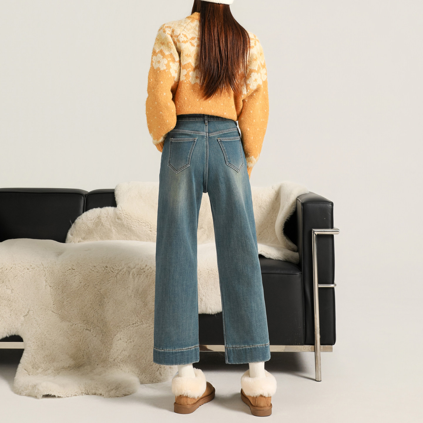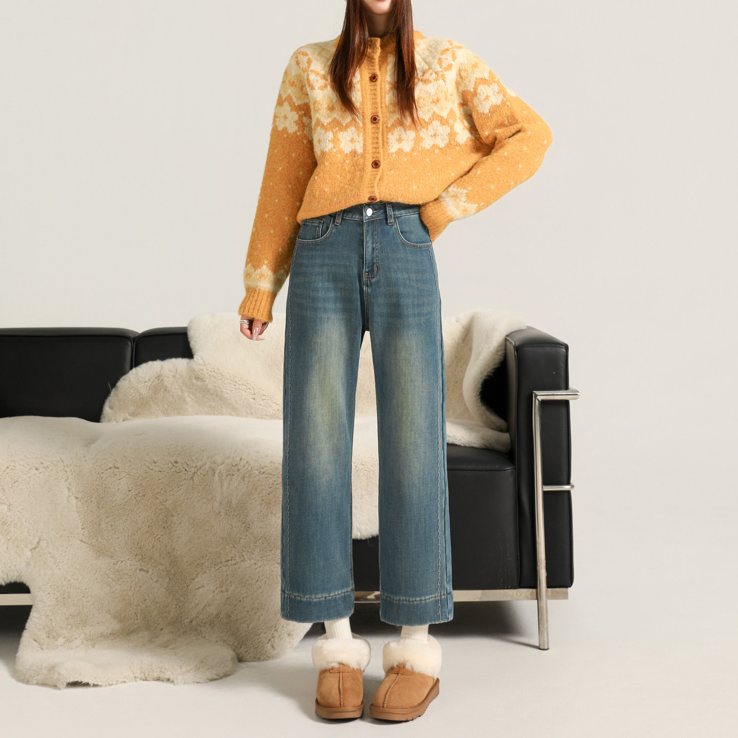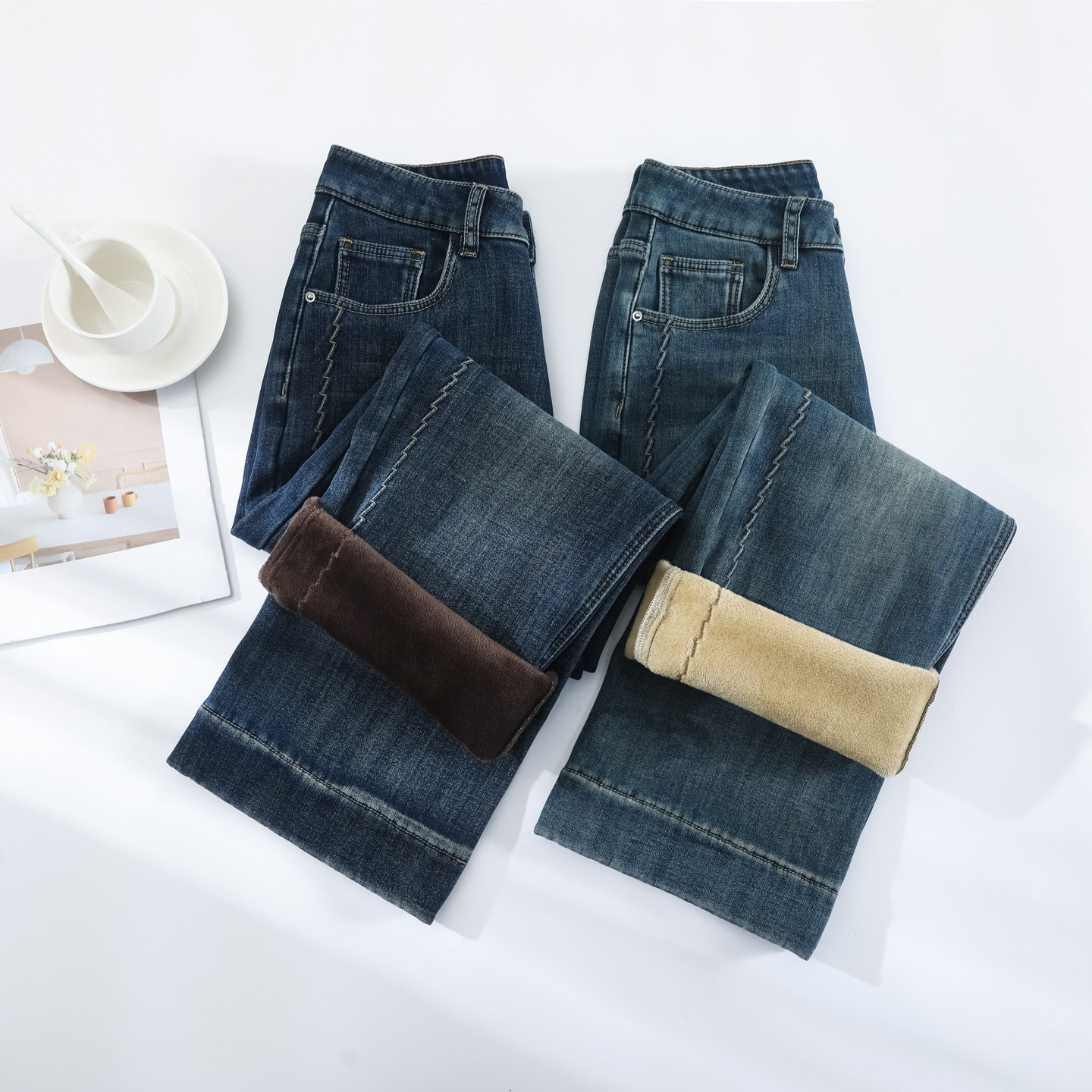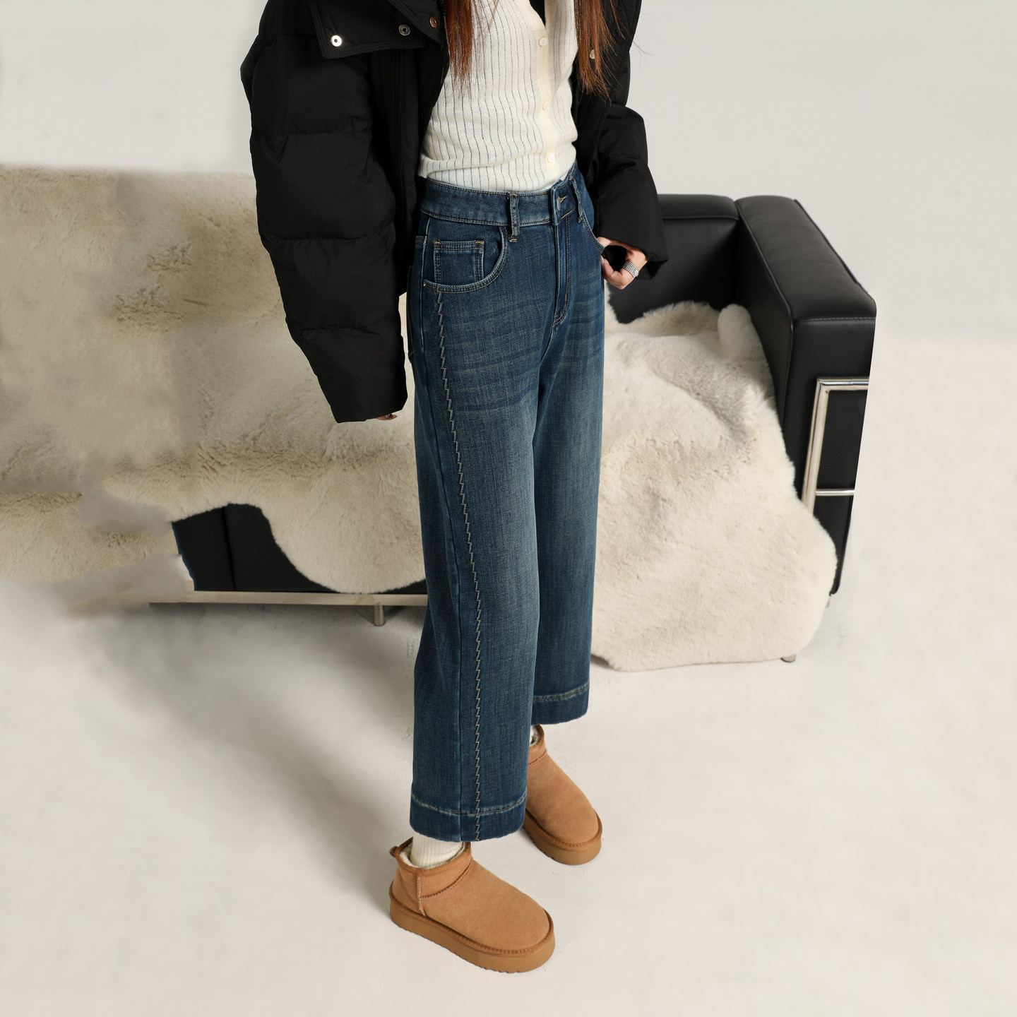 加绒九分直筒牛仔裤女秋冬新款怀旧高腰宽松小个子弹力休闲奶奶裤