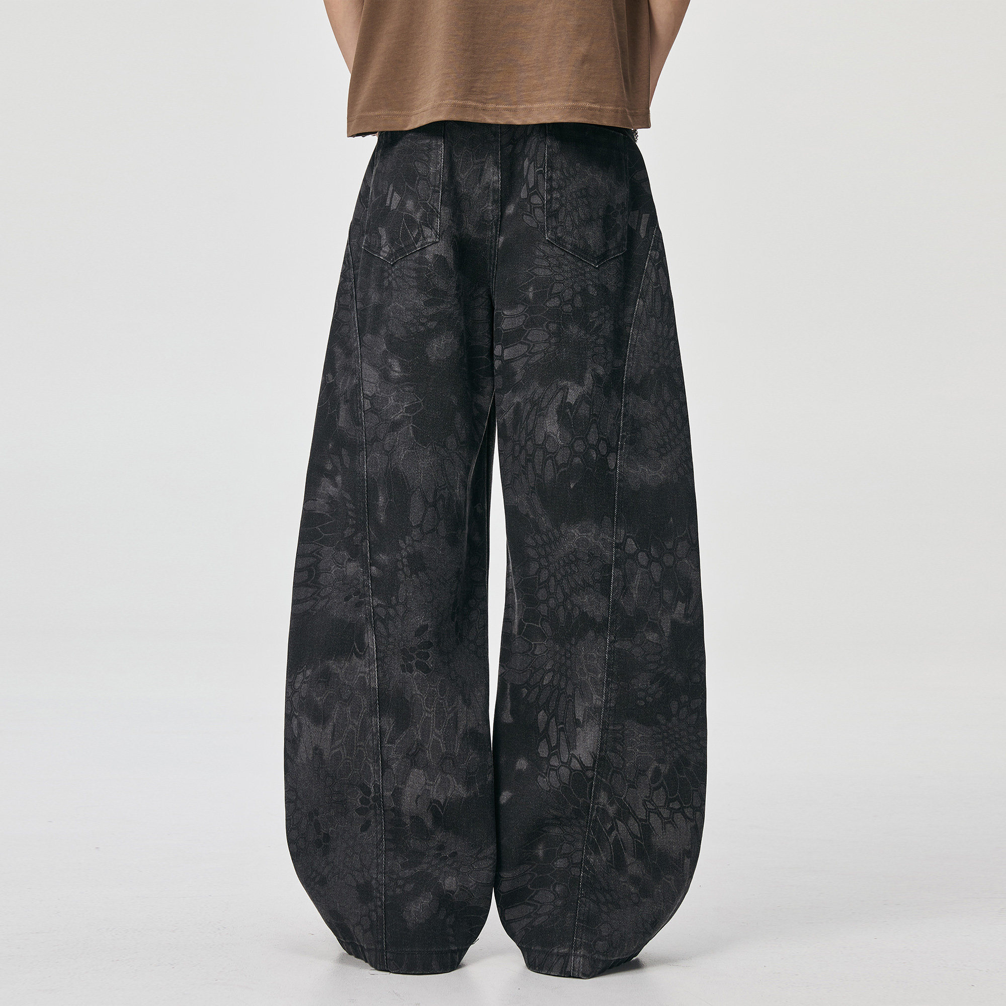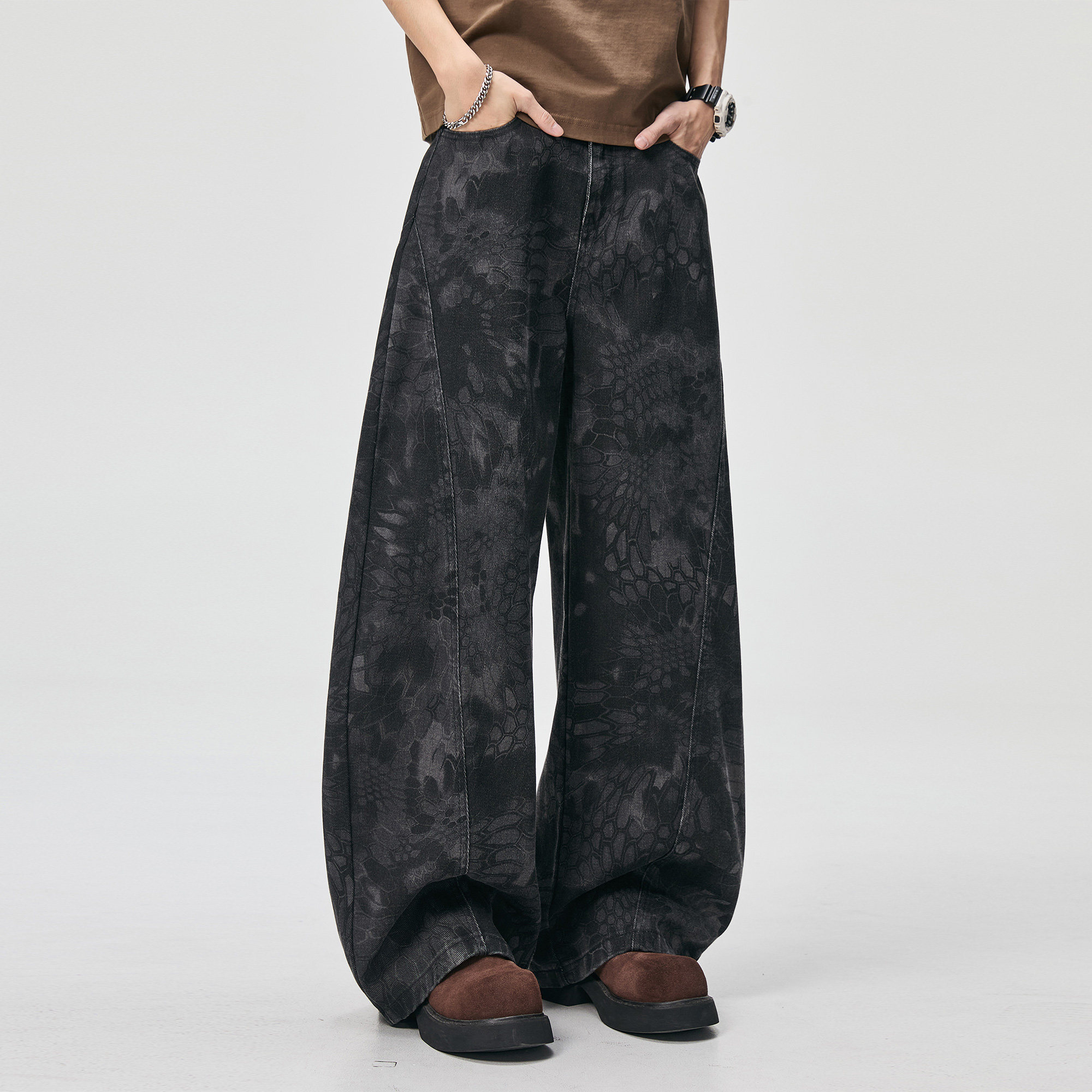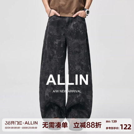 ALLIN 美式印花解构弯刀牛仔裤男春秋cleanfit水洗宽松阔腿长裤子