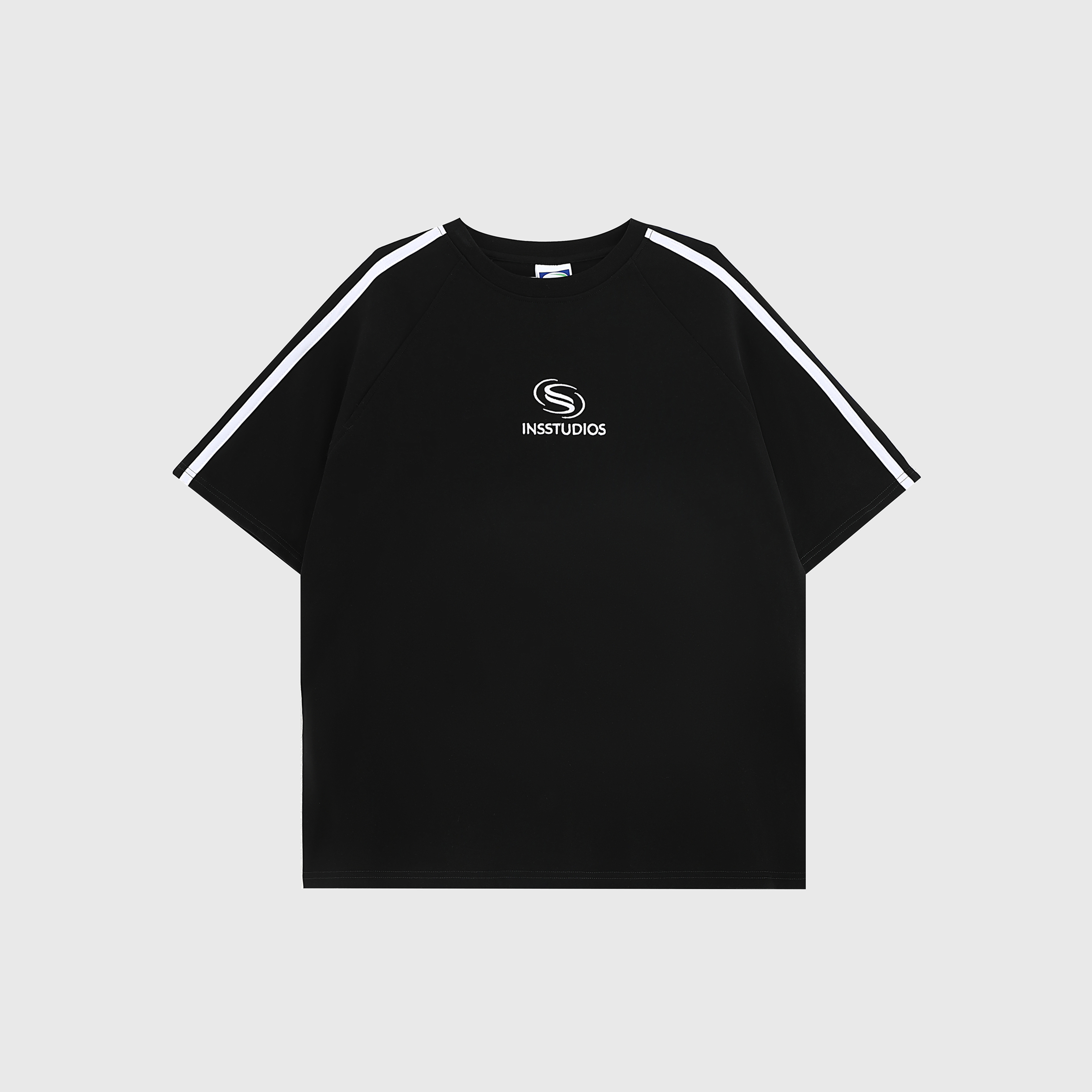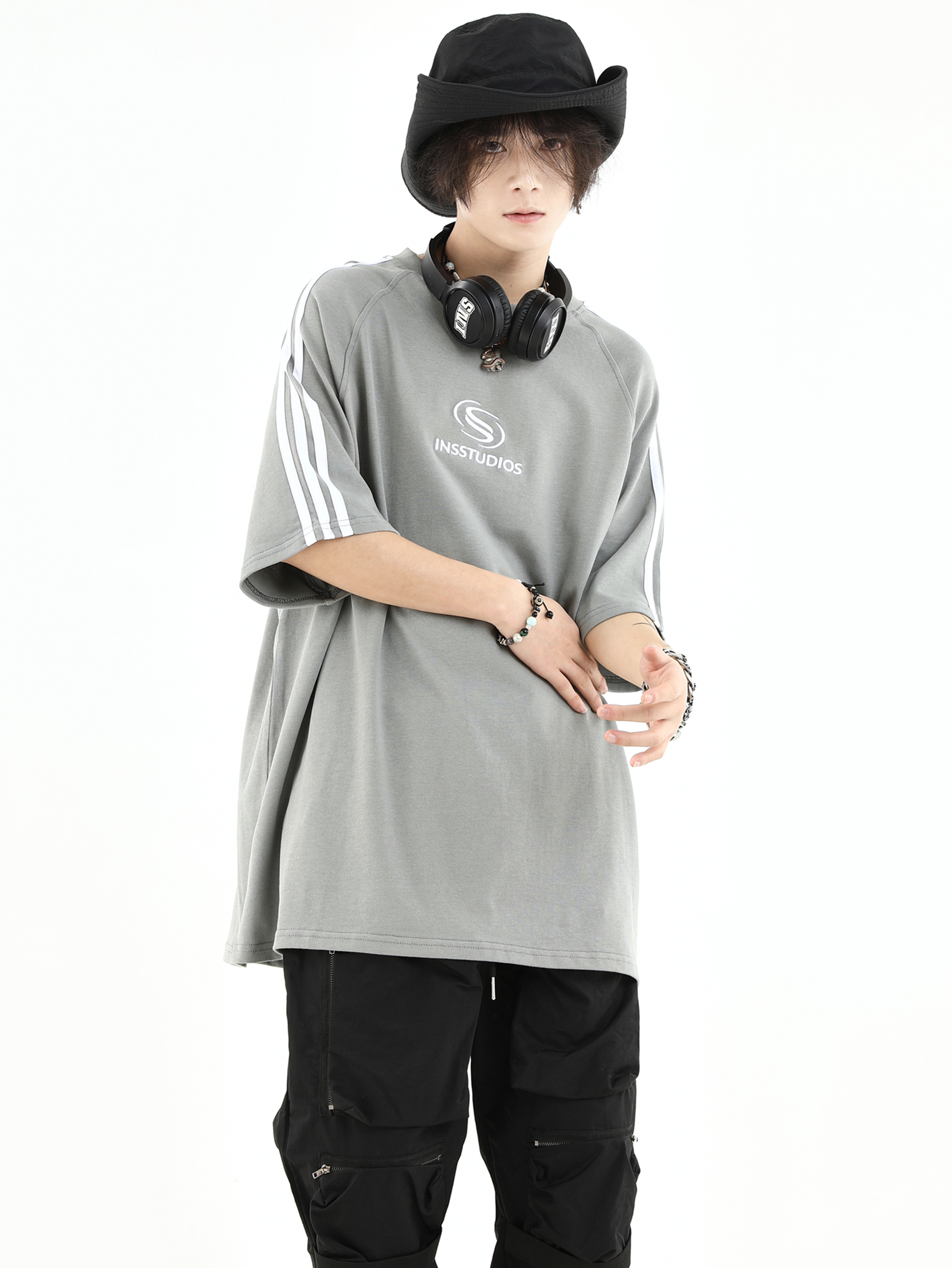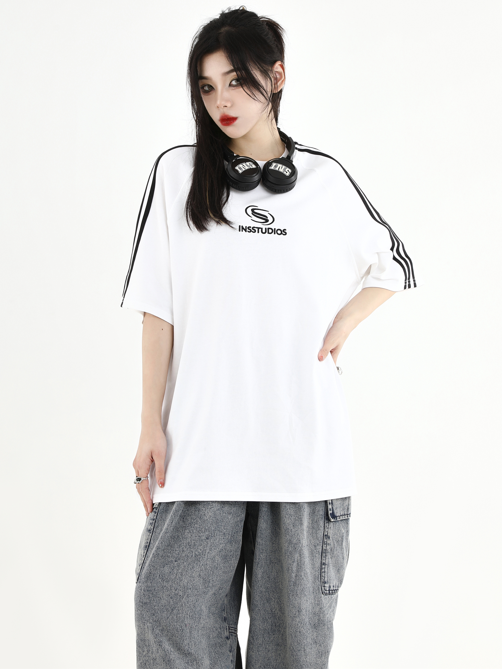 INSstudios 国潮牌情侣美式小LOGO三条杠条纹短袖宽松重磅纯棉T恤