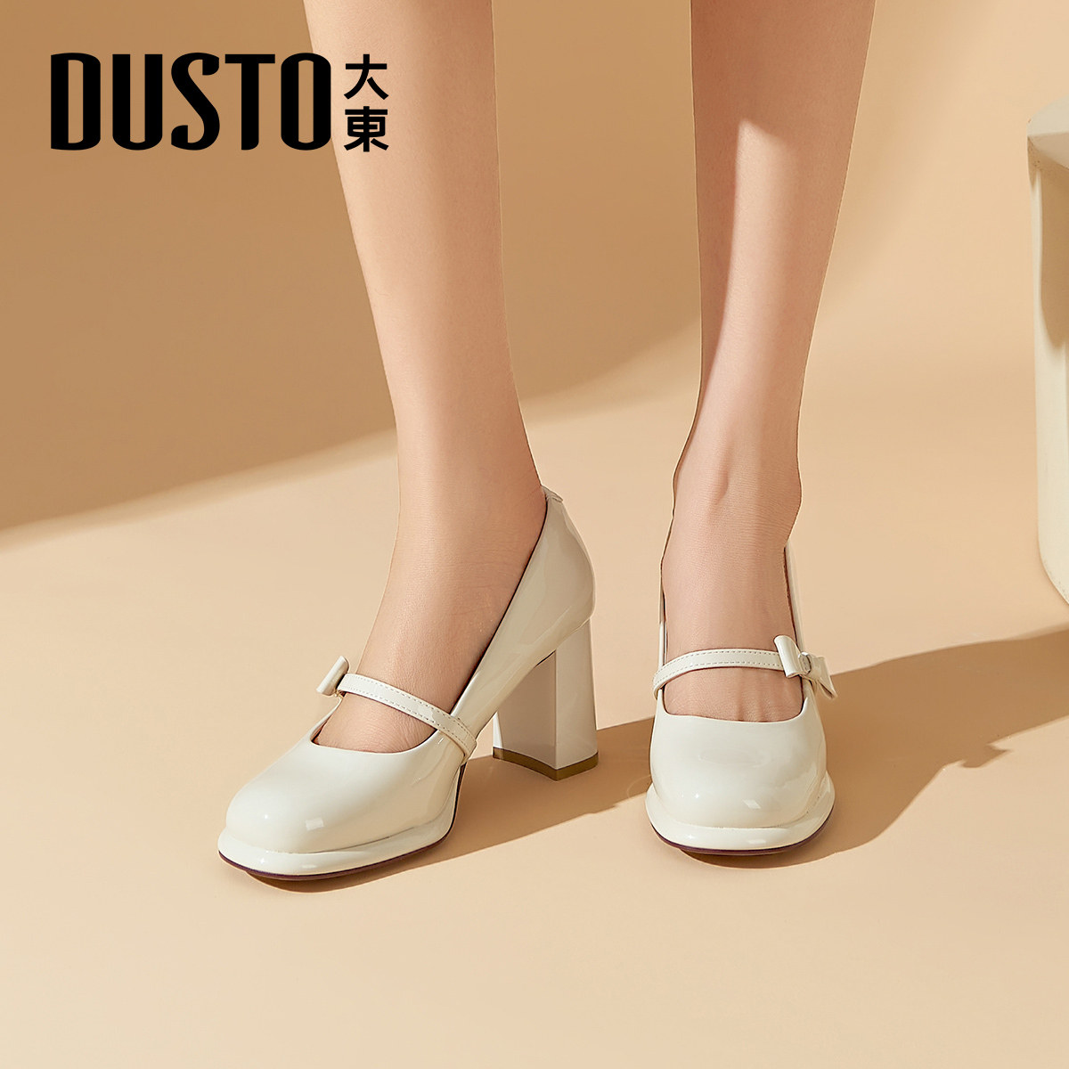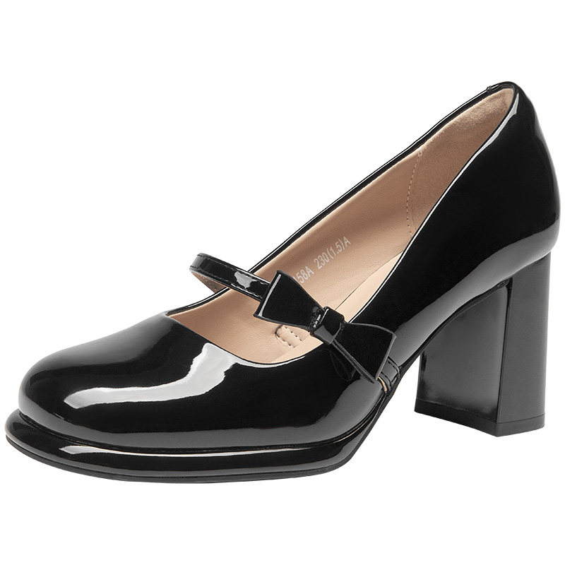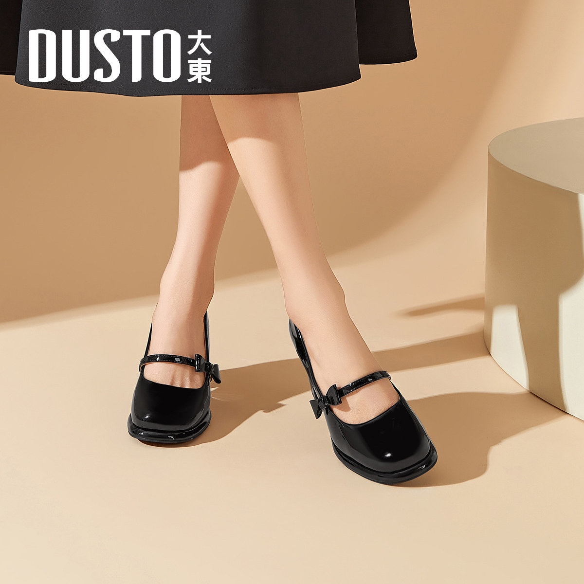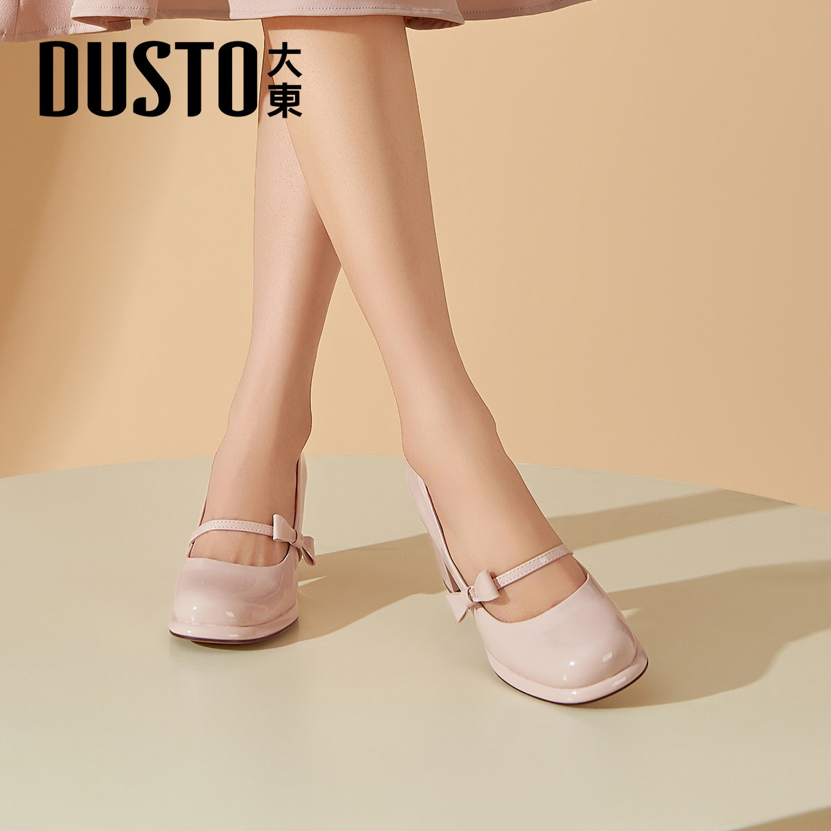 大东玛丽珍高跟鞋女2026新款粗跟浅口黑色配裙子单鞋蝴蝶结小皮鞋