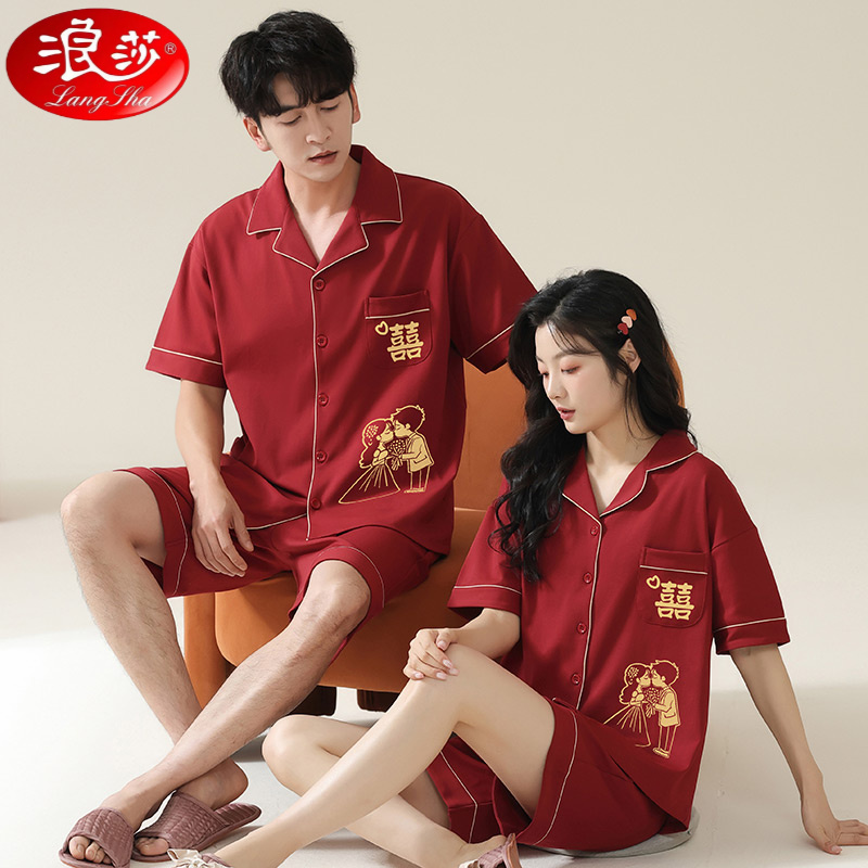 浪莎结婚睡衣情侣短袖纯棉套装夏季男短裤新婚红色女士开衫家居服