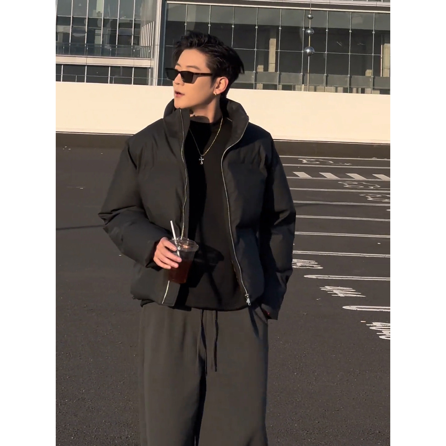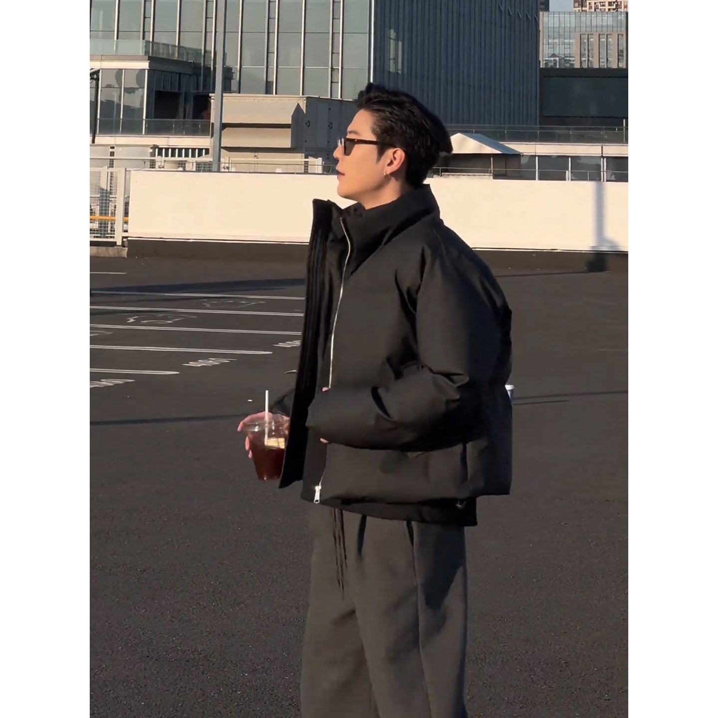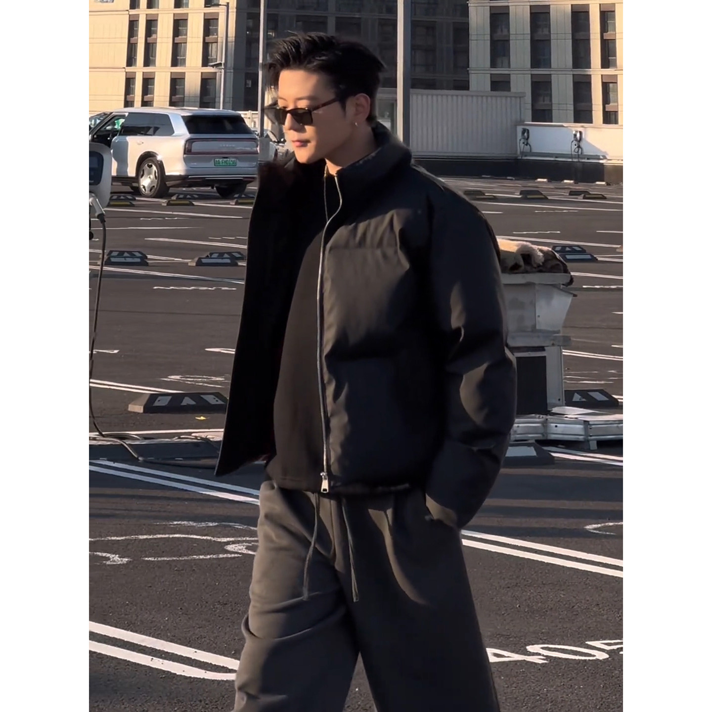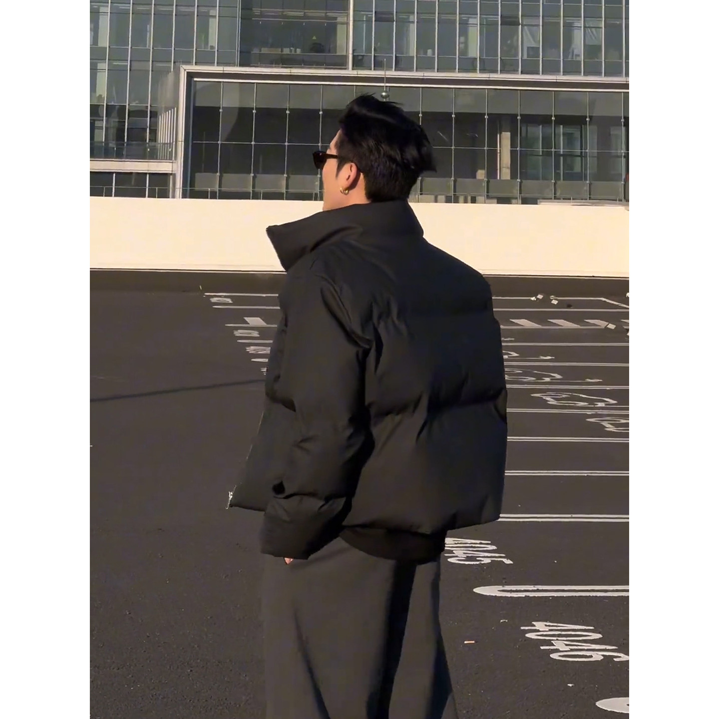 黑色短款pu皮羽绒棉衣男款冬季美式痞帅高级感棉服正肩立领面包服