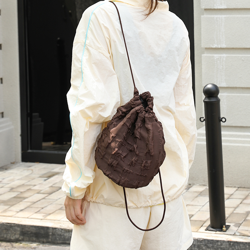 小众设计细肩带褶皱抽绳水桶包女小包包2023新款百搭帆布双肩背包