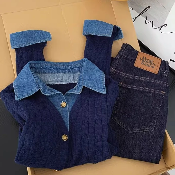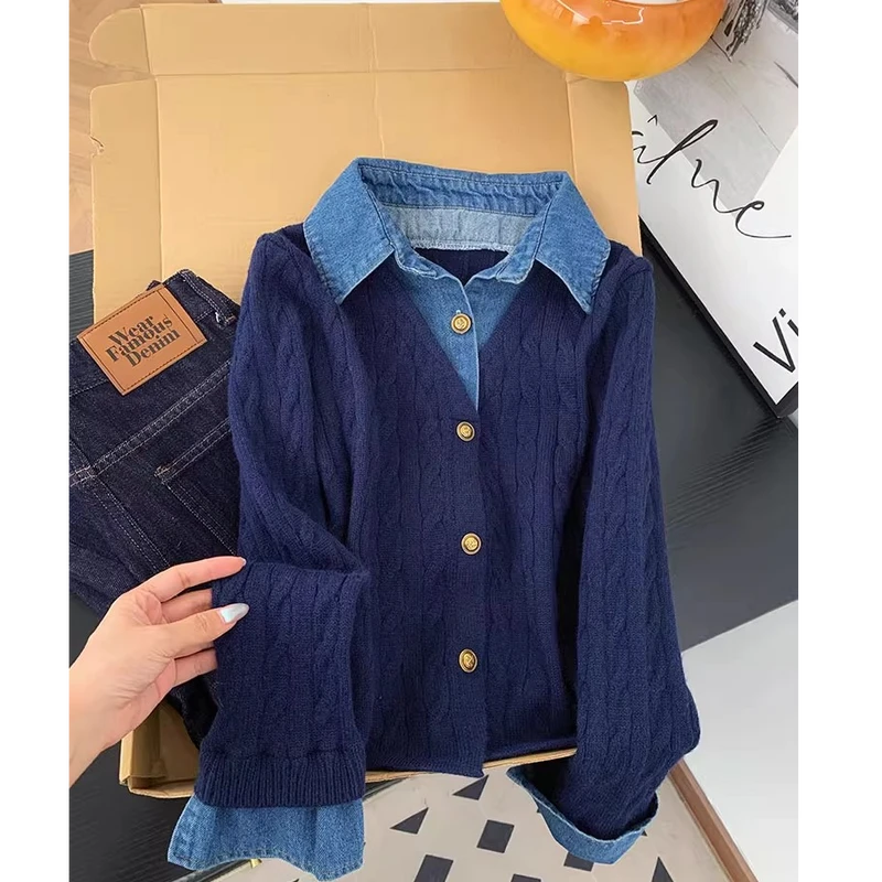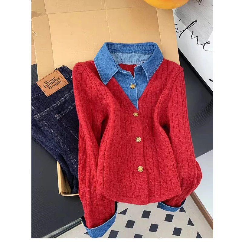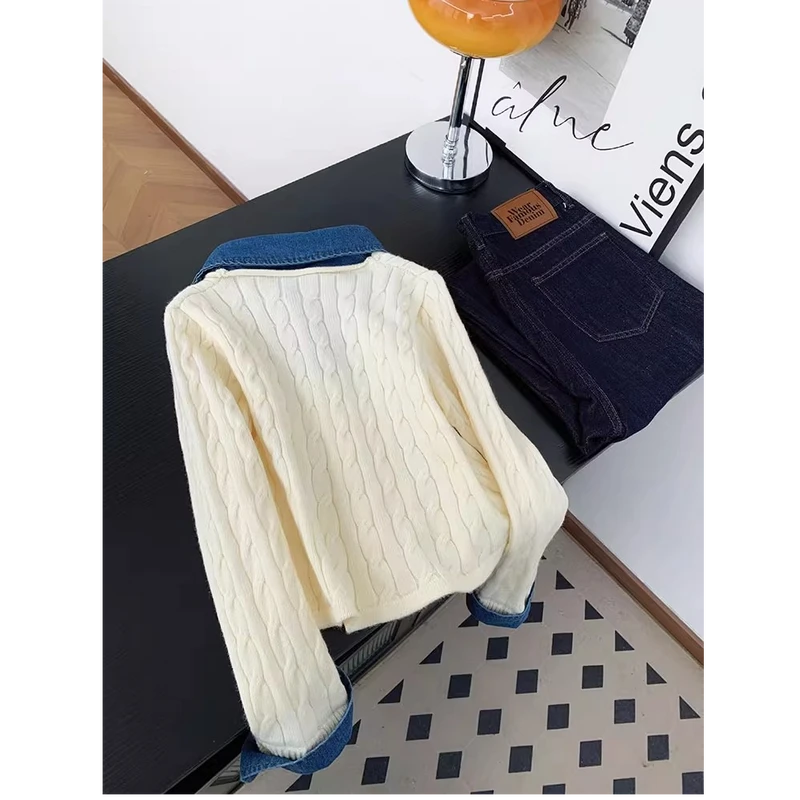 2025秋季新款法式气质牛仔拼接假两件翻领针织开衫短款麻花毛衣女