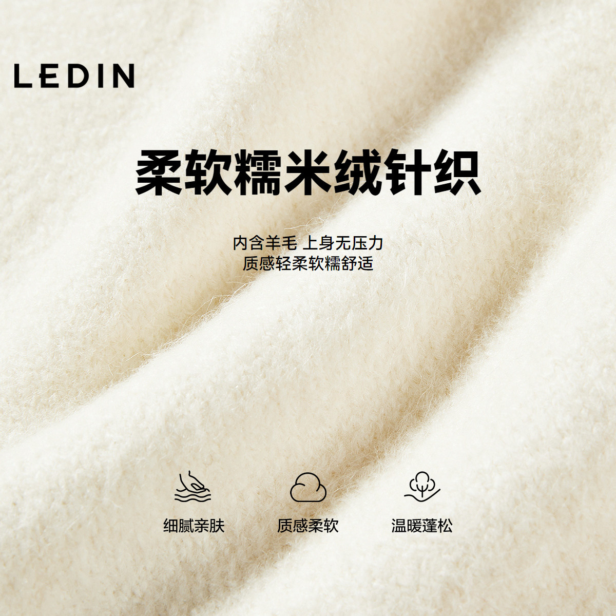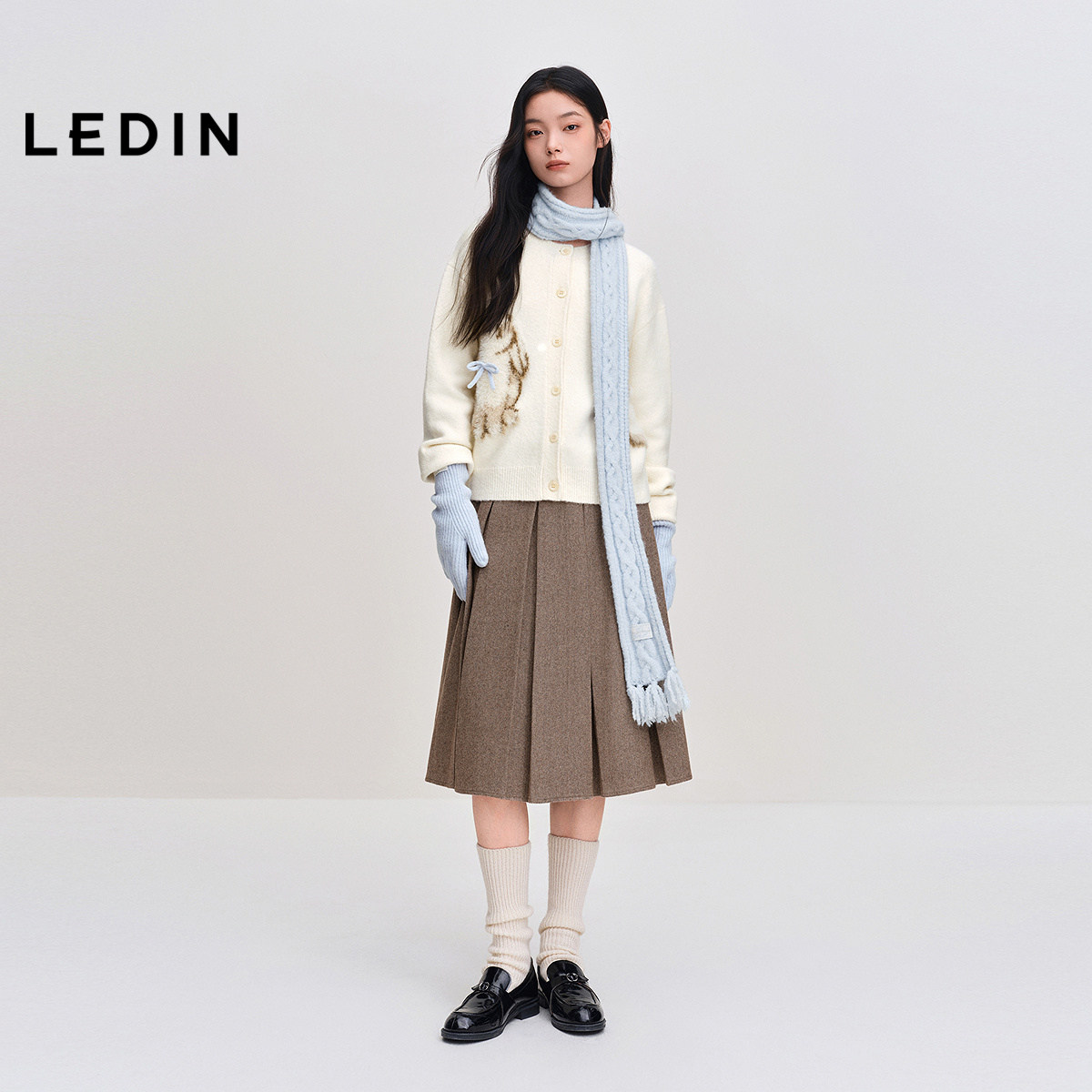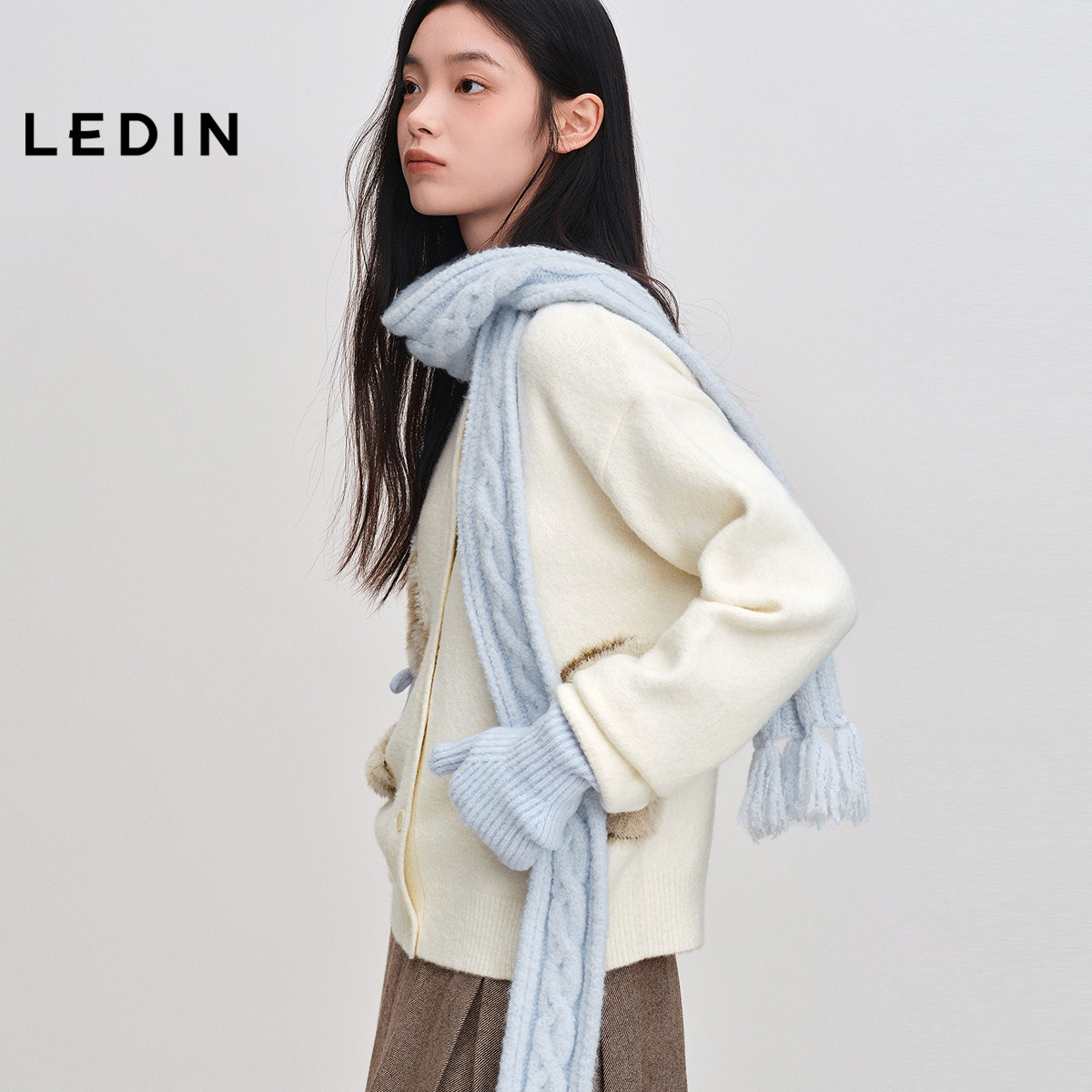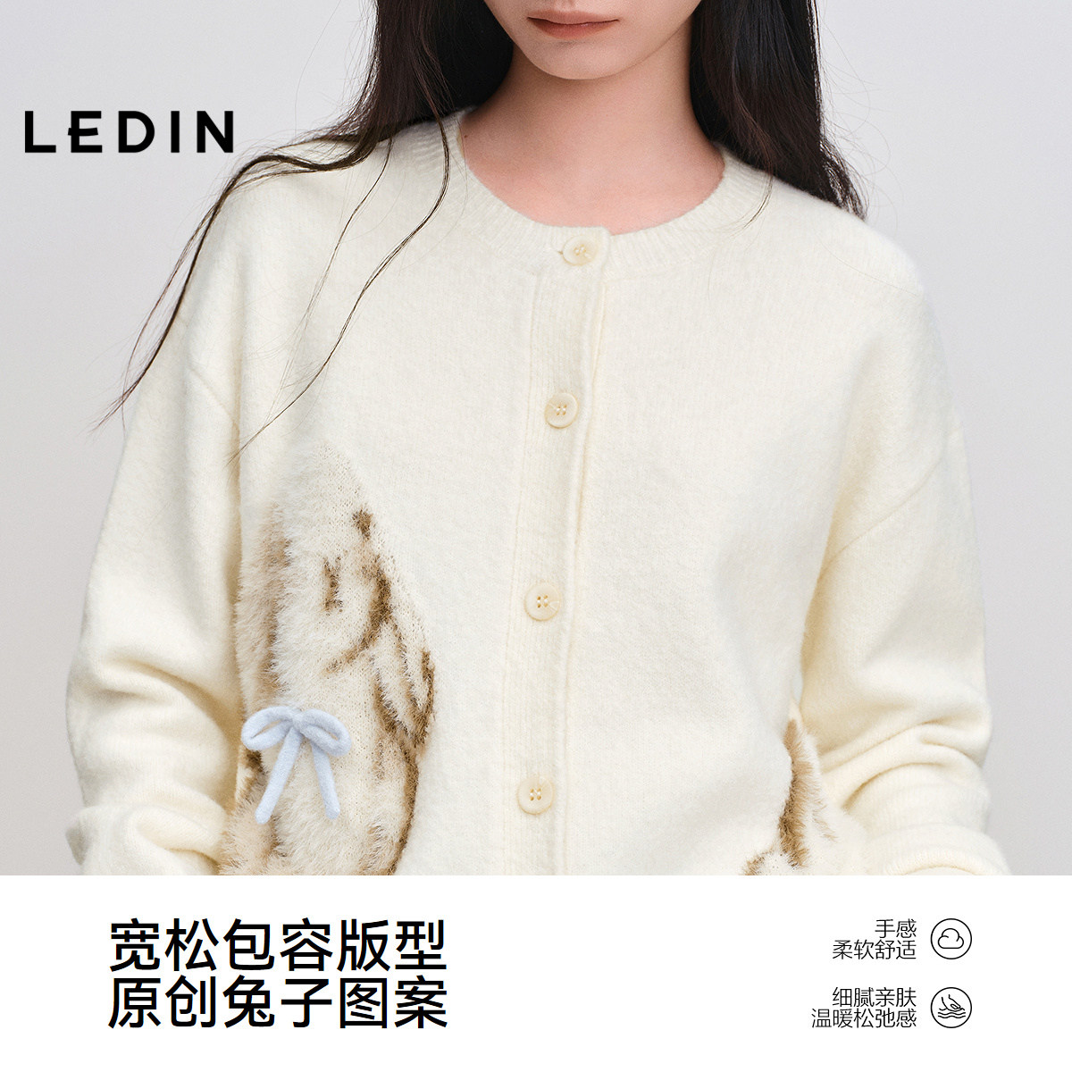 乐町立体绒感兔子针织开衫女25年冬季新款含羊毛白色圆领毛衣外套