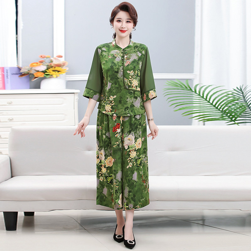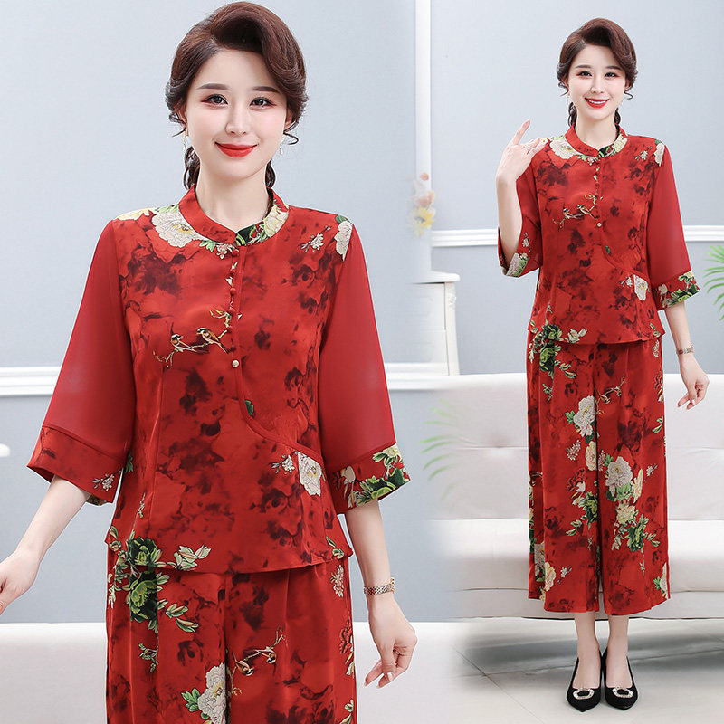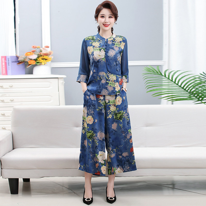 中老年春装桑蚕丝上衣阔腿裤