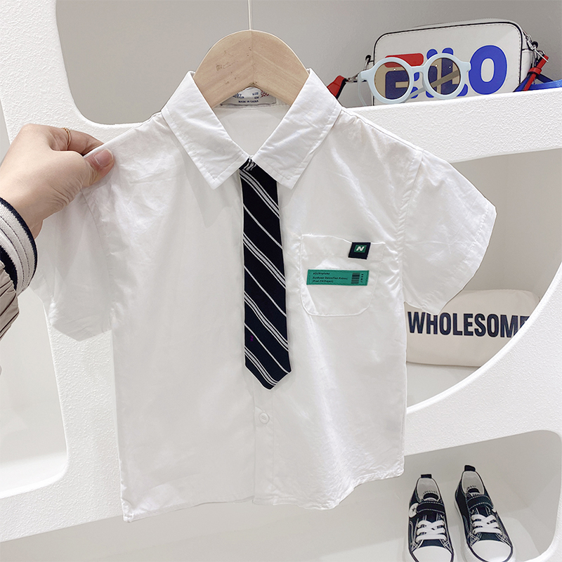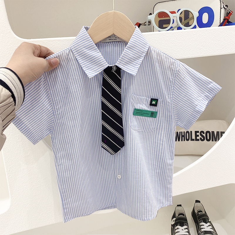 男童短袖衬衣新款春秋装薄款时尚小领带中小儿童潮洋气纯棉衬衫