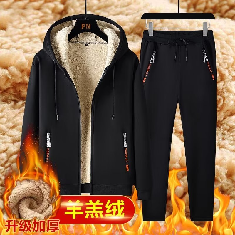 连帽拉链卫衣男士秋冬季新加绒加厚380羊羔绒套装现货百搭两件套