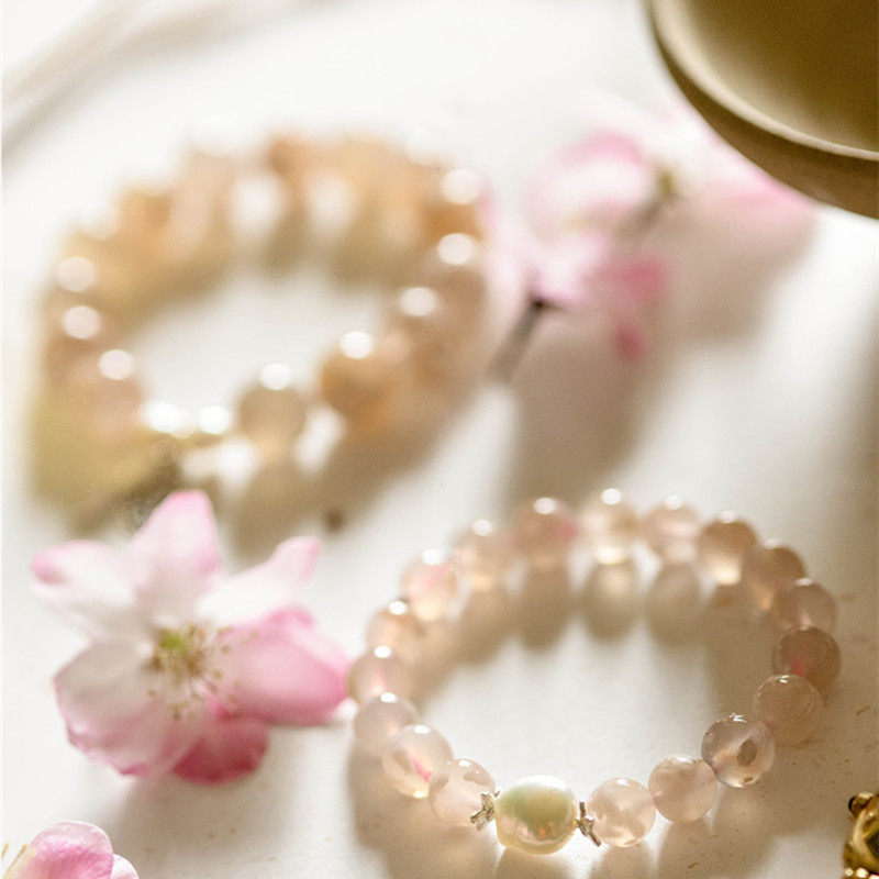 樱花玛瑙8mm手串粉色玉髓珍珠手链飘花水晶女友礼物闺蜜小清新