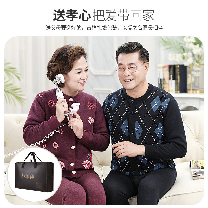 恒源祥中老年人羊羔绒保暖内衣套装女士加厚加绒印花秋衣秋裤男冬
