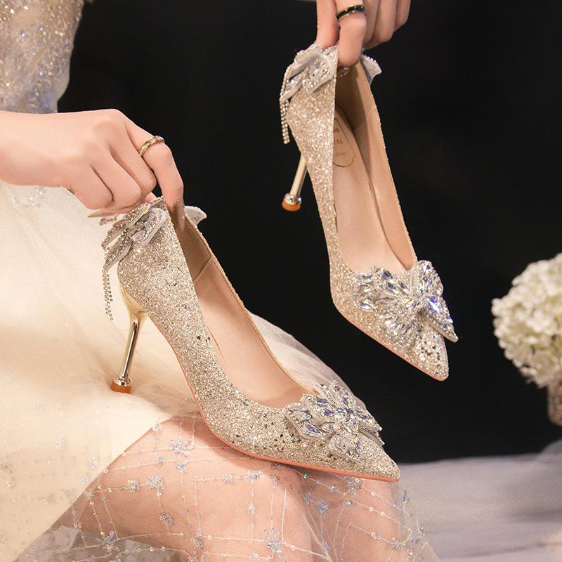 亮片婚鞋水钻蝴蝶结重工法式高级感新娘鞋尖头细跟婚礼高跟敬酒鞋