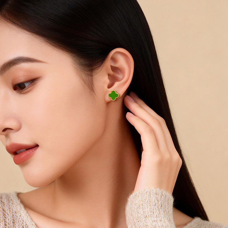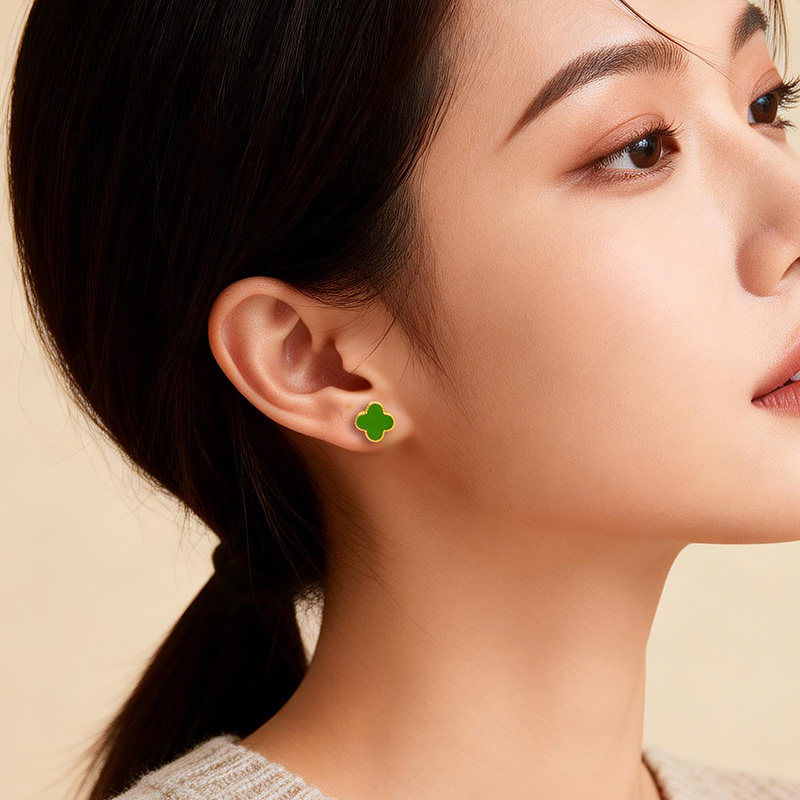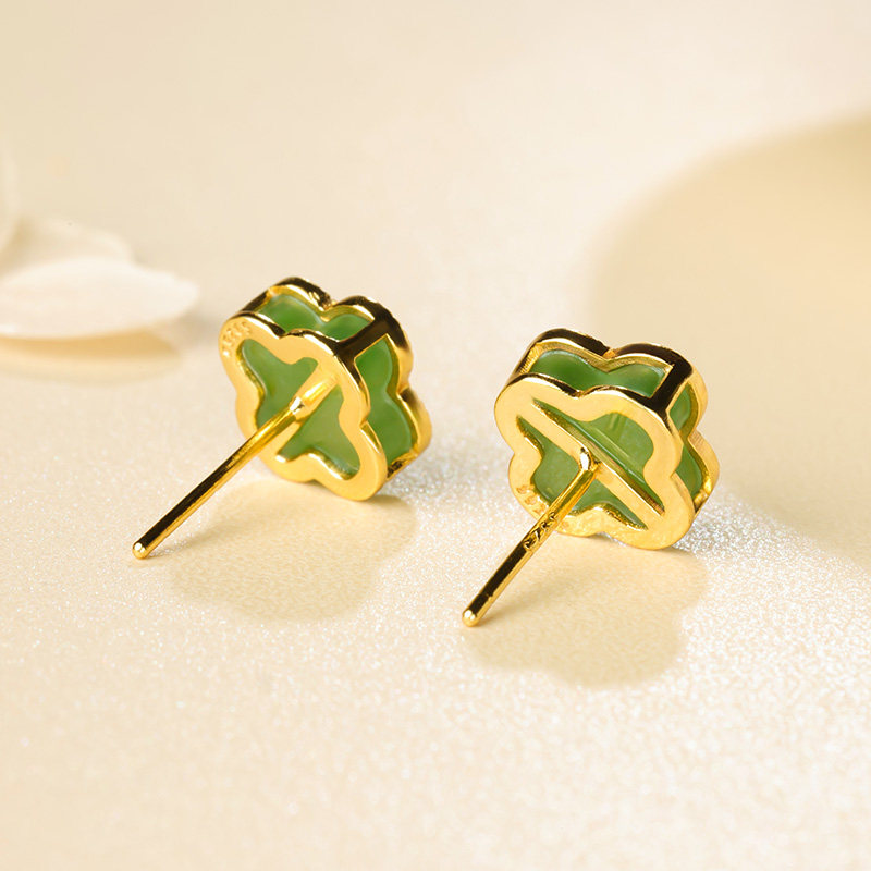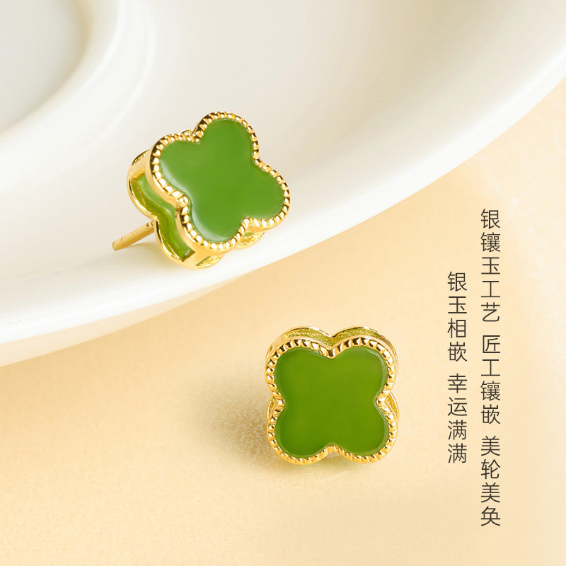 印象眸S925银和田玉耳钉女款碧玉四叶草耳饰简约新中式生日礼物