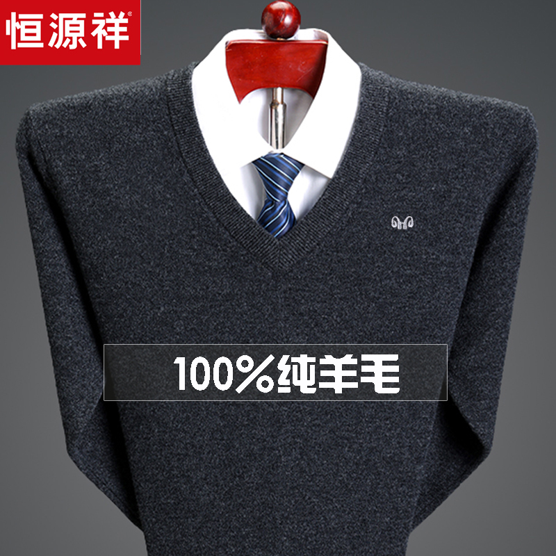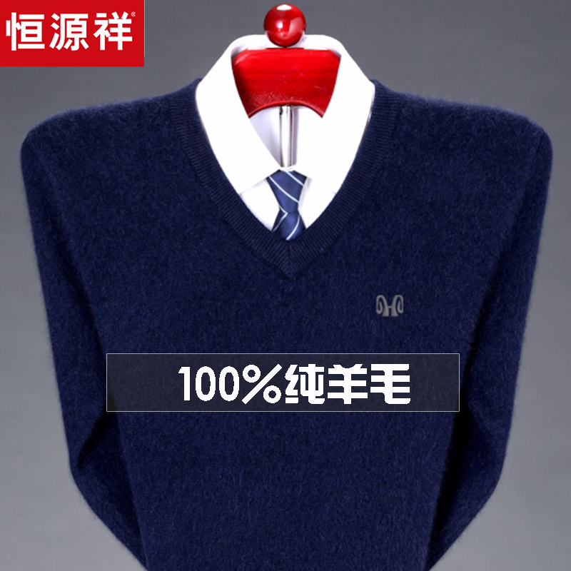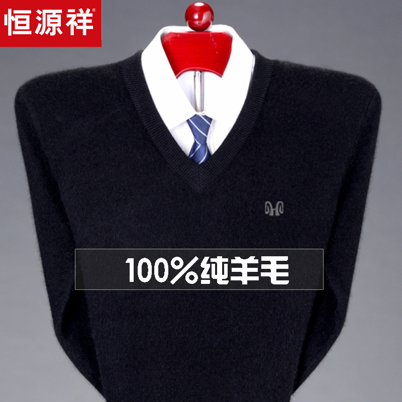 恒源祥羊毛衫男冬季V领加厚中老年男装鸡心领打底羊绒毛衣爸爸装