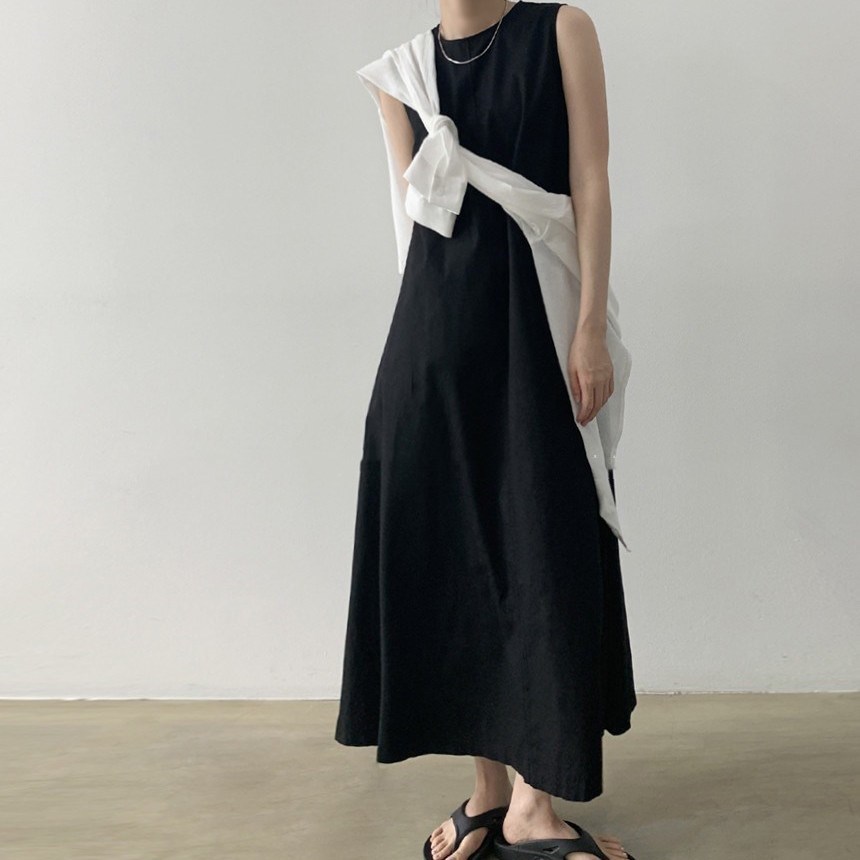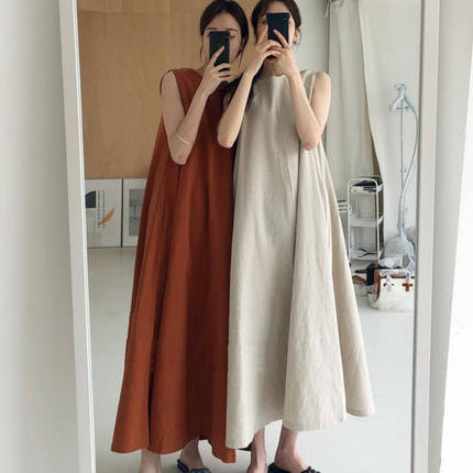 天然棉麻圆领宽松纯色休闲大摆无袖长款棉麻连衣裙过膝大码孕妇装