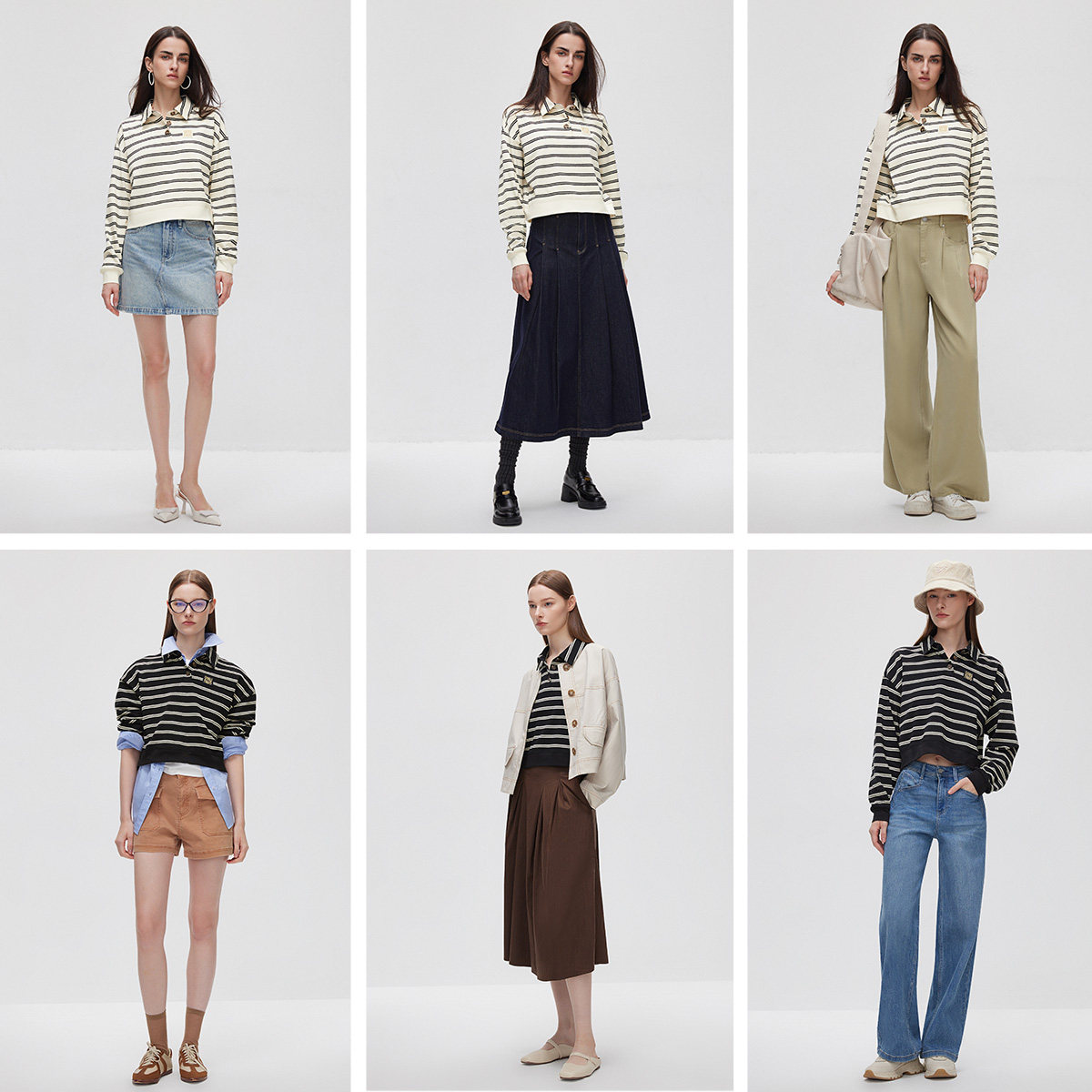 【ONLY奥莱】秋冬休闲日常POLO领纯棉条纹长袖卫衣女