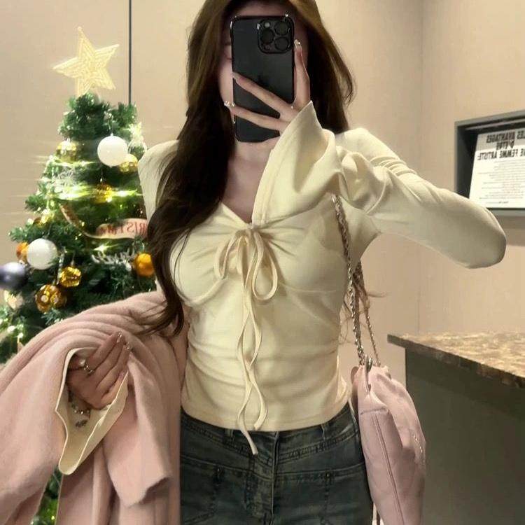 美式纯欲绑带V领长袖T恤女设计感秋季新款修身显瘦内搭打底上衣潮