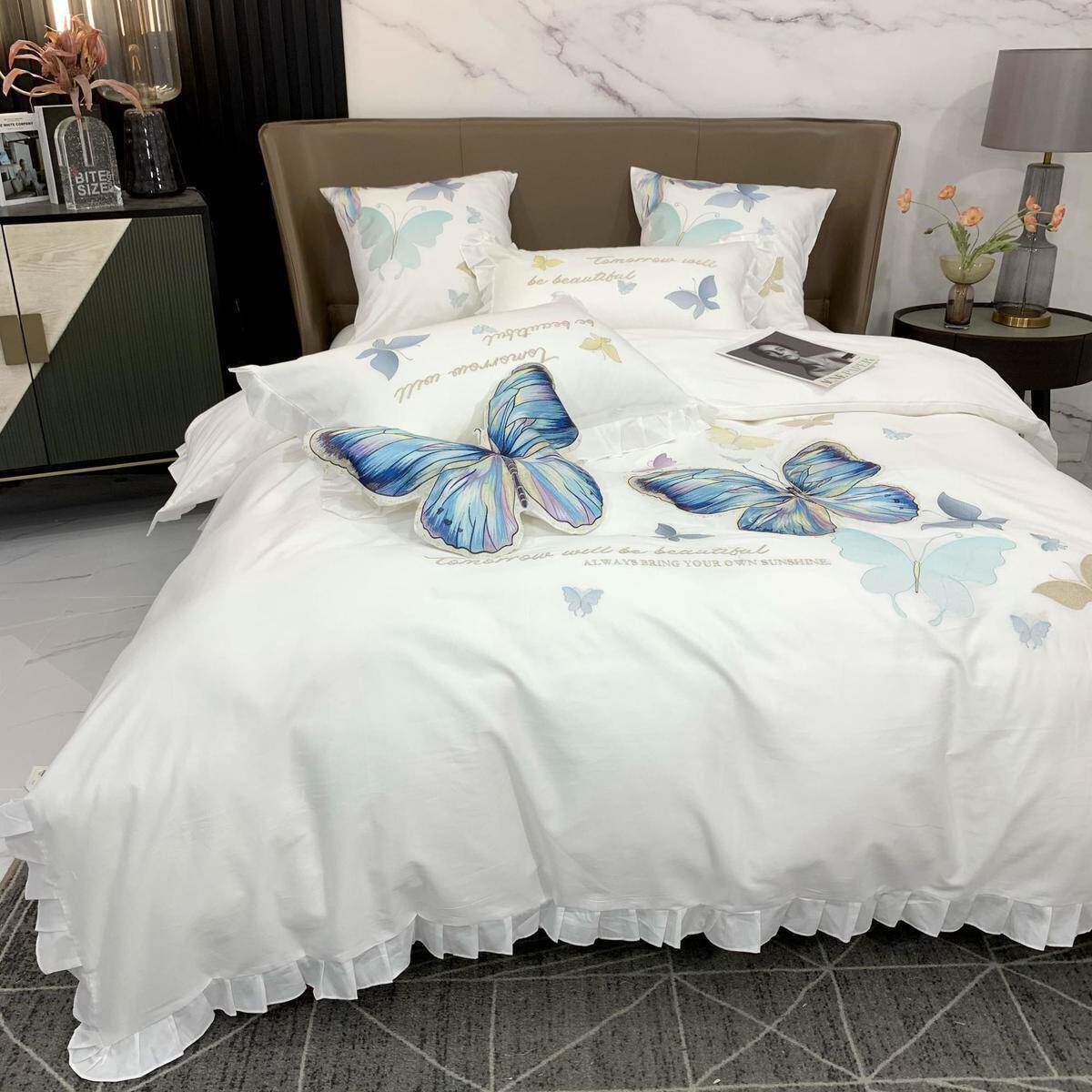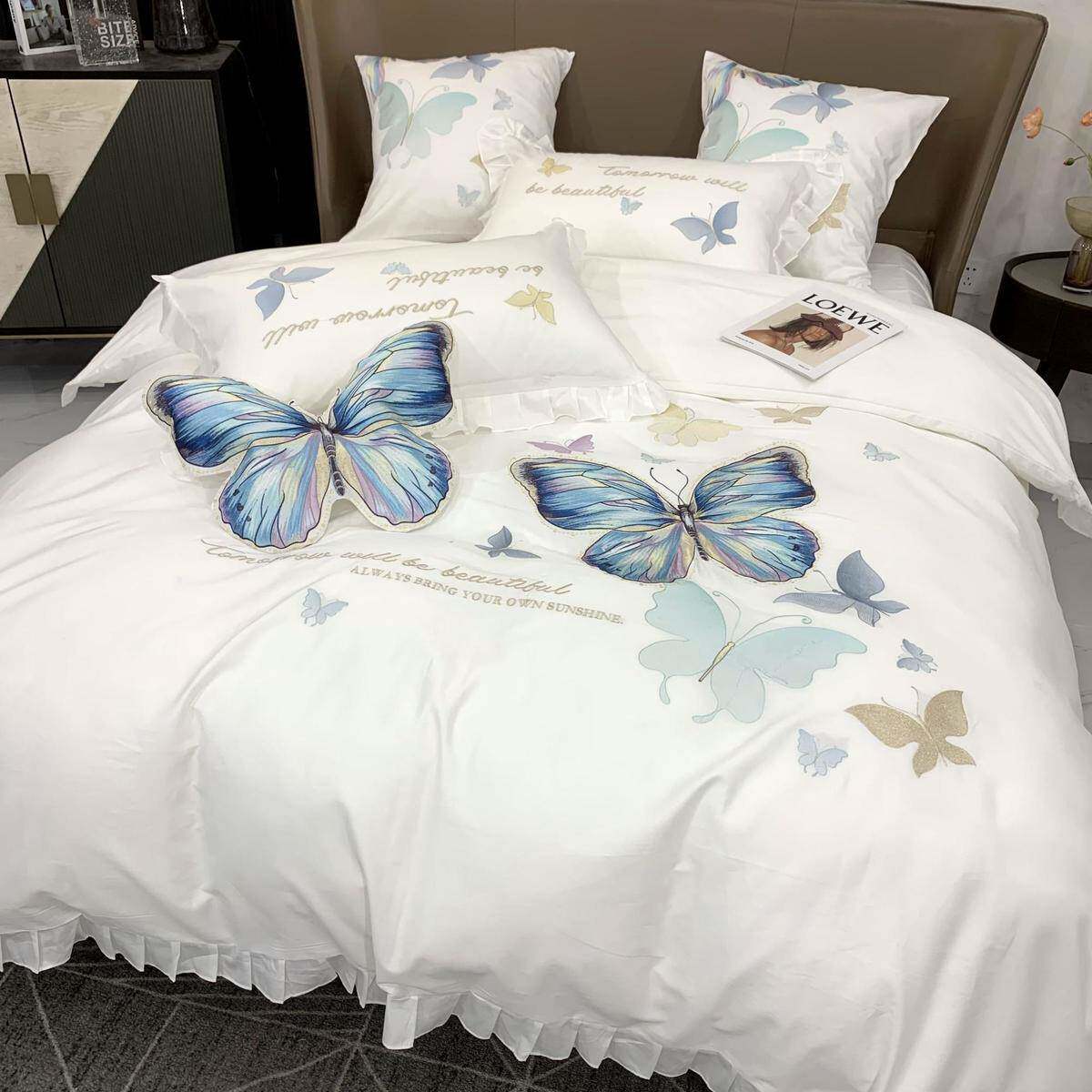 X5L轻奢欧全棉四件套纯蝶刺绣贡式缎被套NQK白蝴色酒店风床单棉床