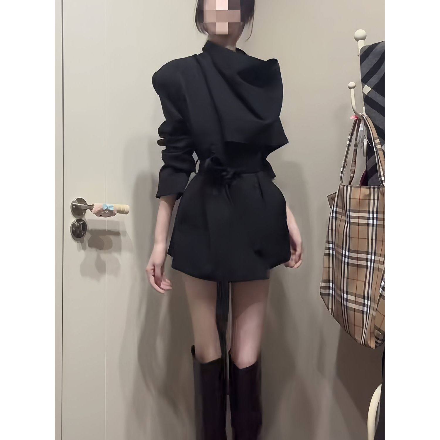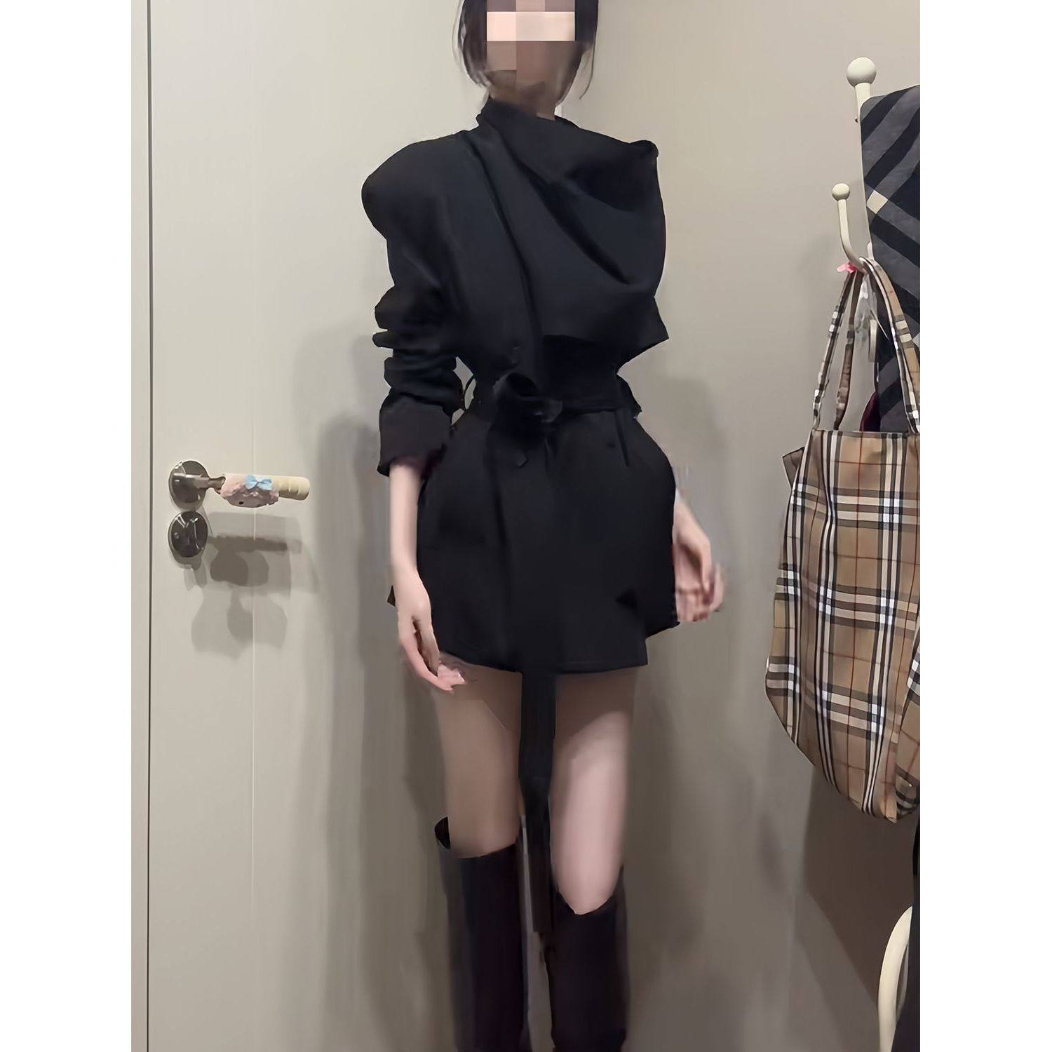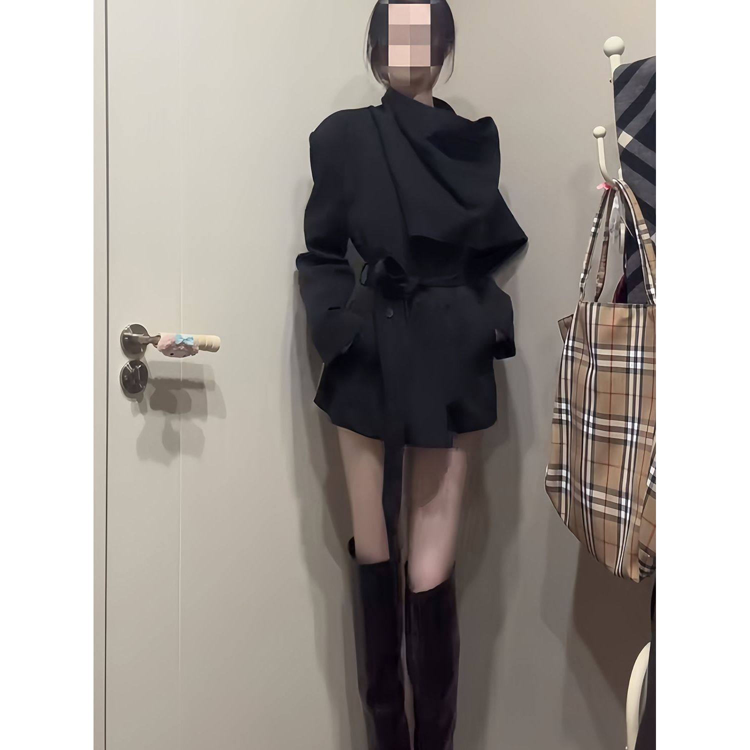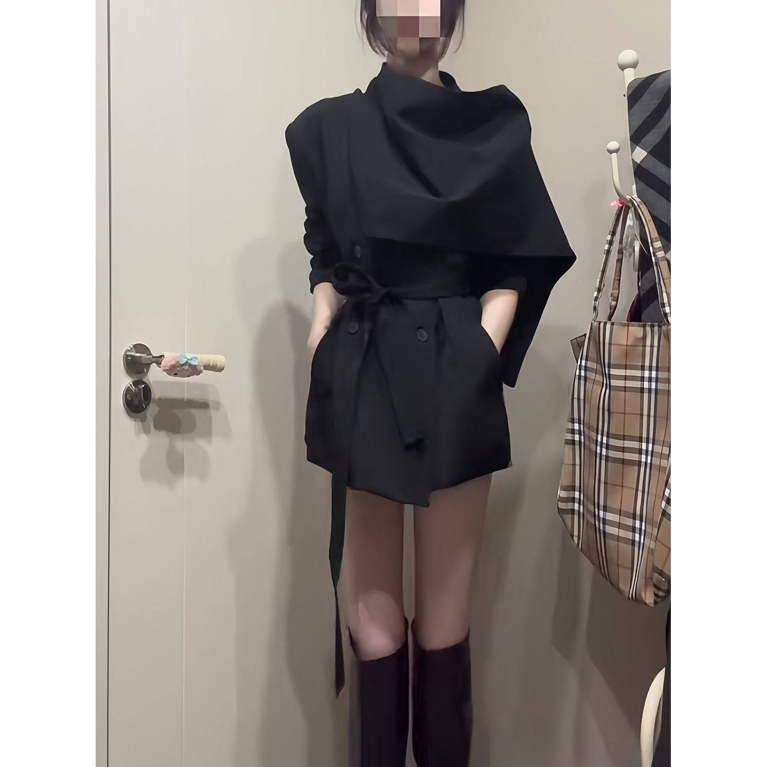 短款黑武士 黑色廓形围巾短款风衣女秋冬设计感修身显瘦披肩外套