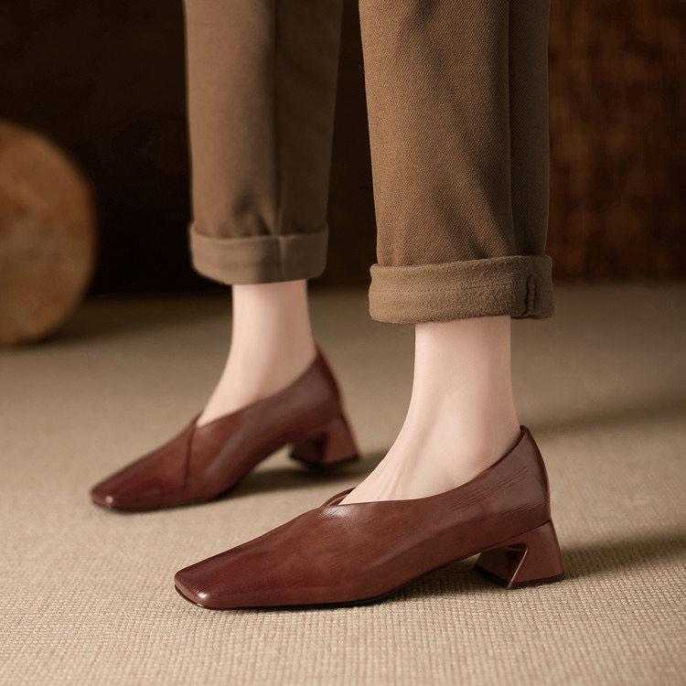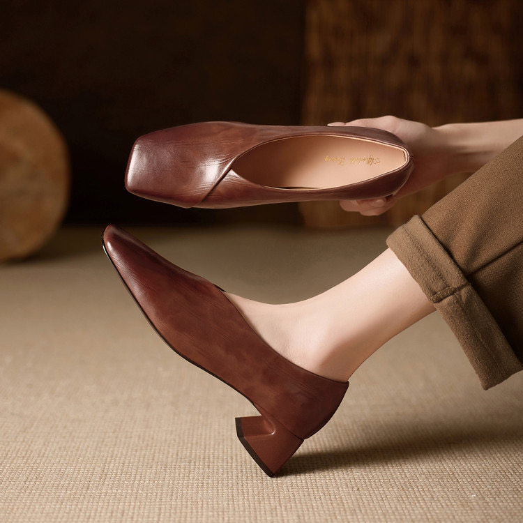 真皮粗跟方头单鞋女新款复古女鞋软皮软底百搭中跟浅口奶奶鞋
