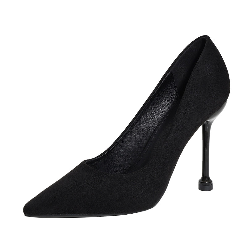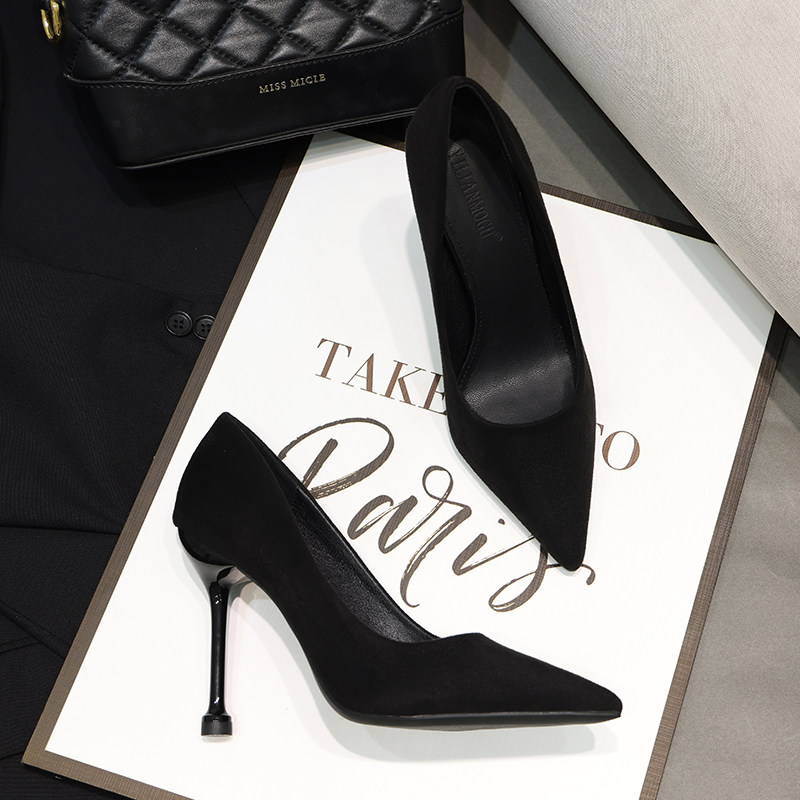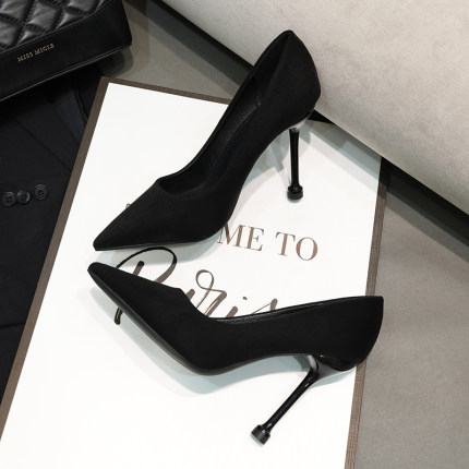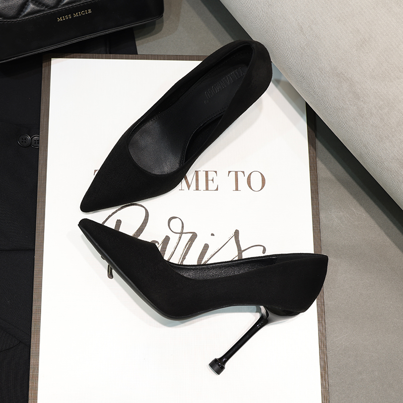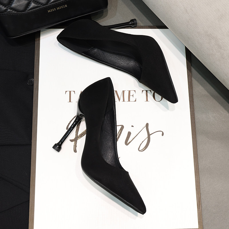 2025春季绒面设计感小众黑色职业尖头细跟女 高跟鞋百搭单鞋女鞋