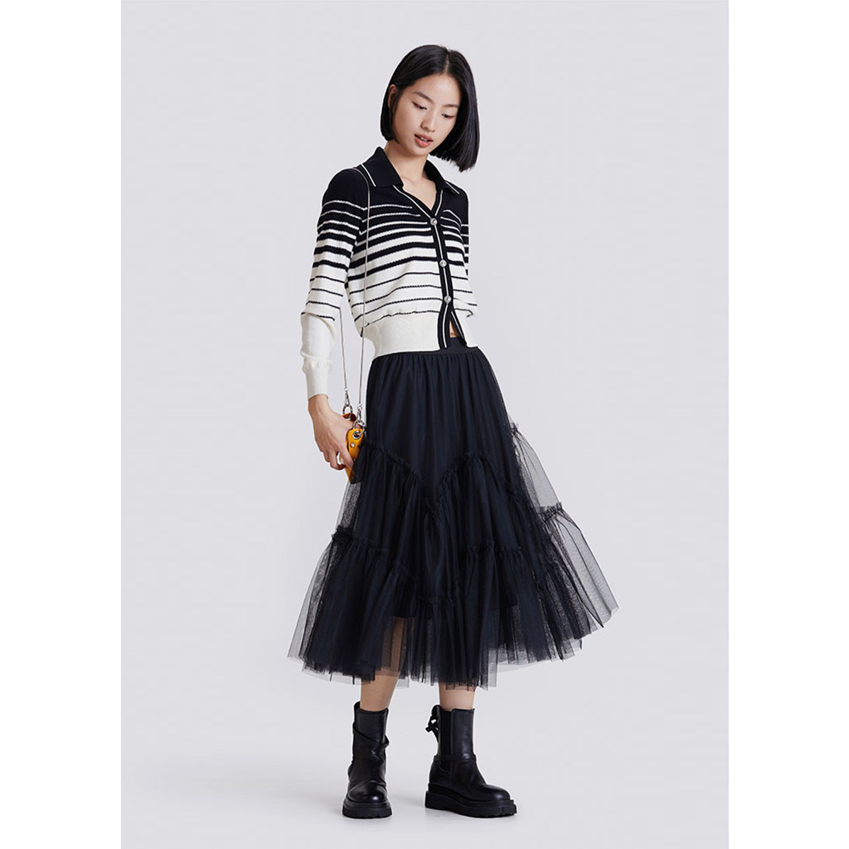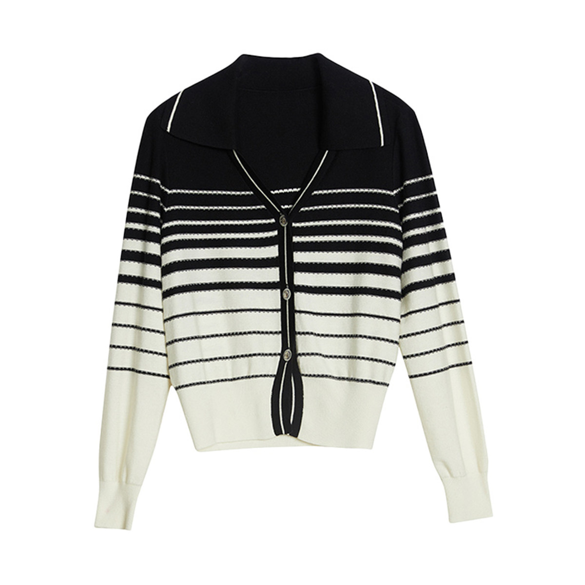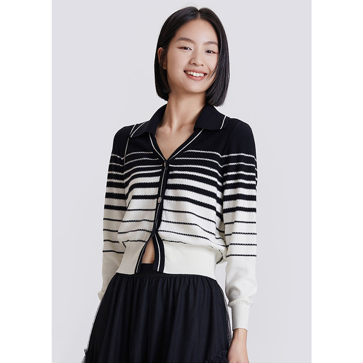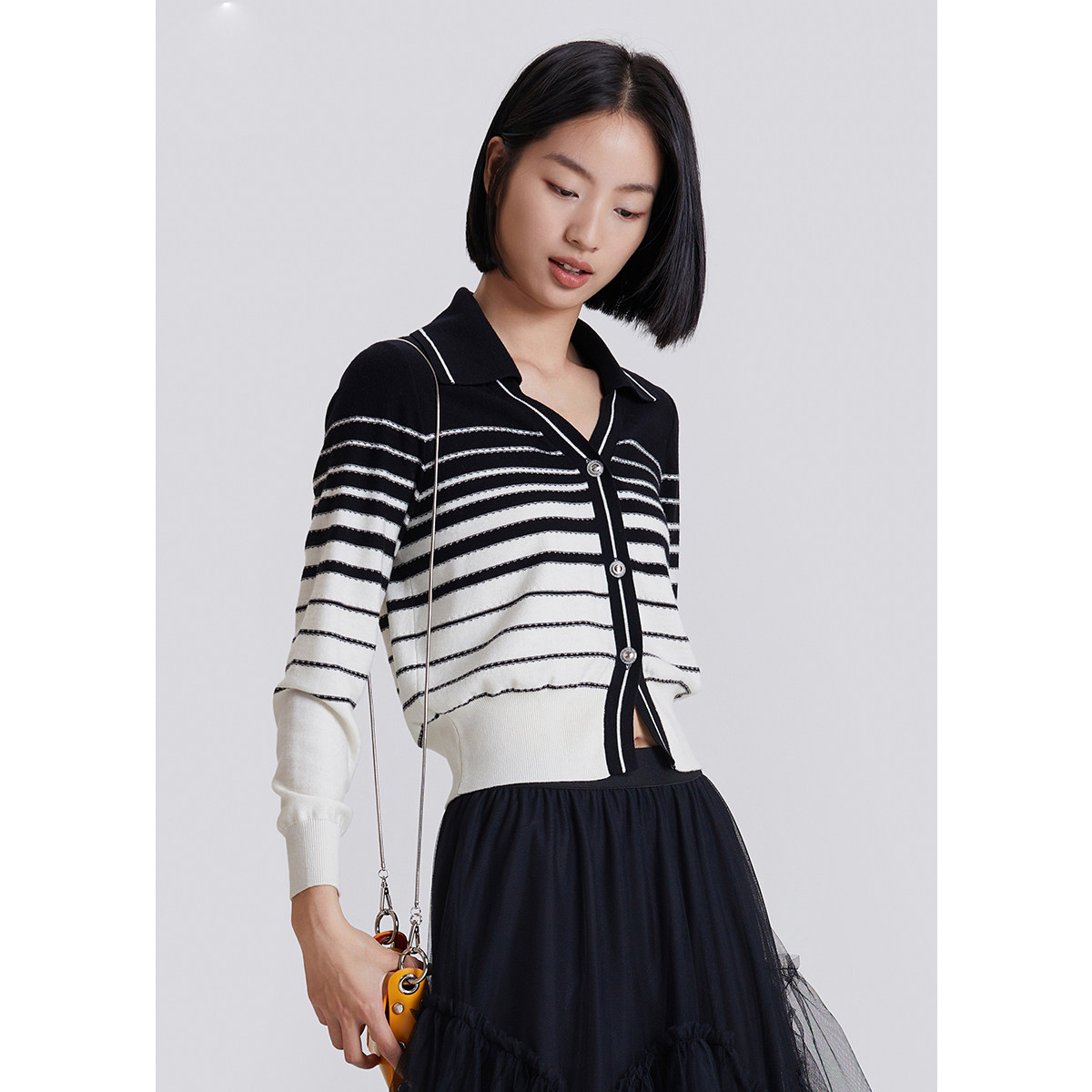 SANI奥莱特卖商场同款冬季绵羊毛翻领针织开衫短款条纹毛衣外套女