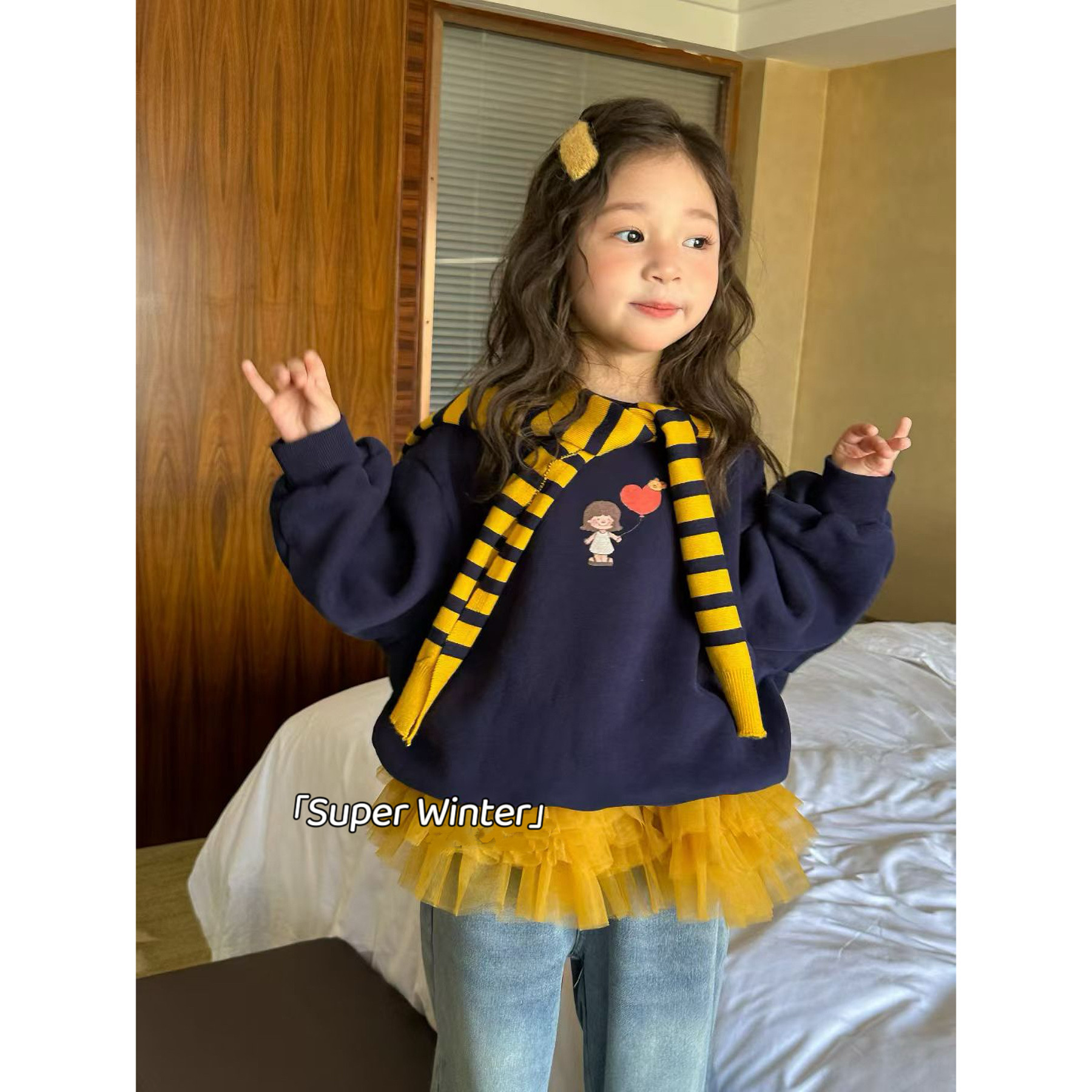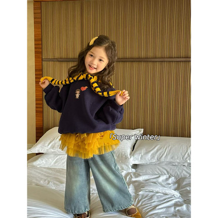 女童冬季新款韩版卡通印花加绒带条纹披肩卫衣休闲屁帘牛仔裤套装