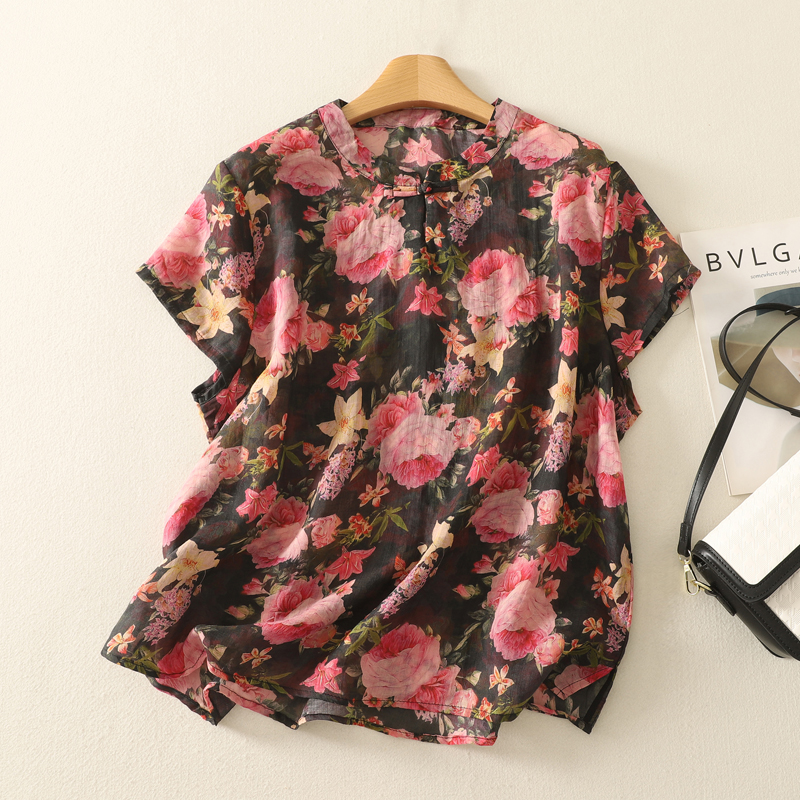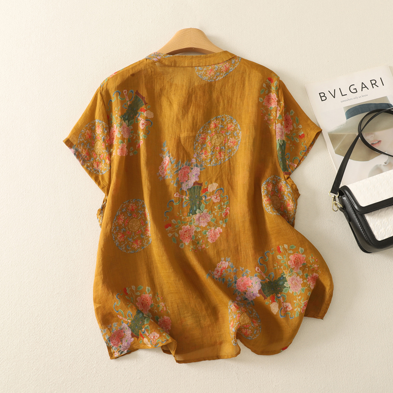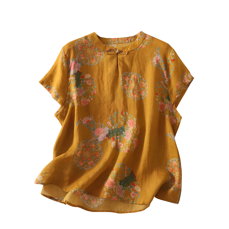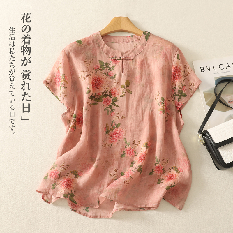 薄中式印花棉麻麻小衫女夏季新款宽松禅意斜襟立领短袖上衣妈妈装