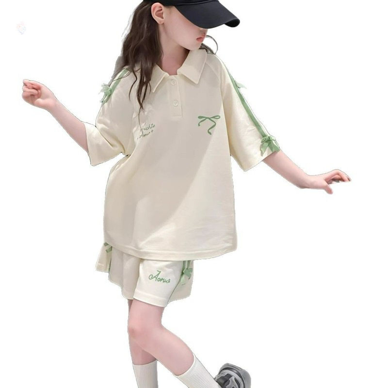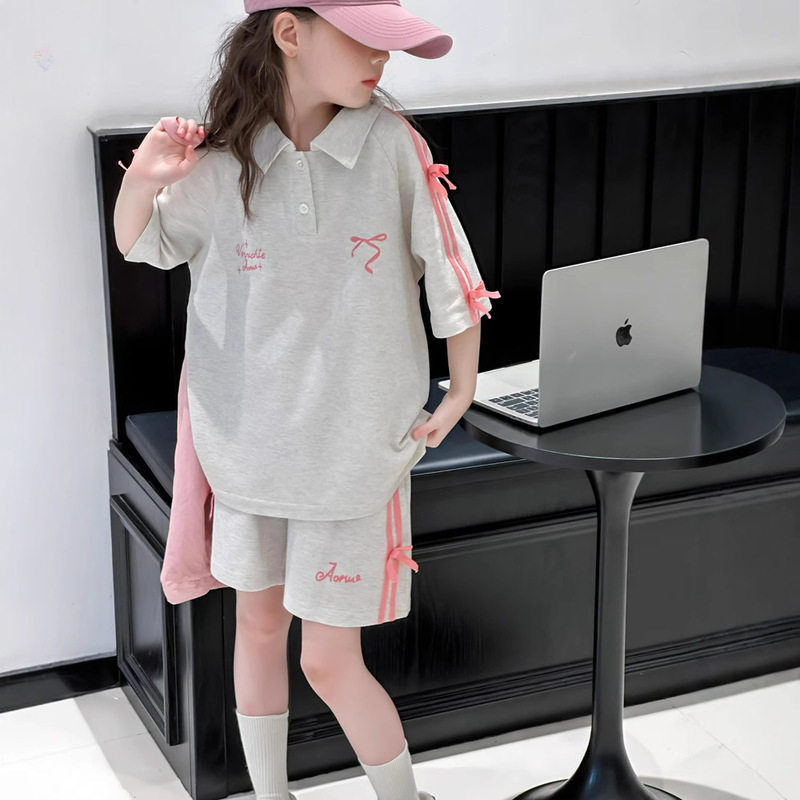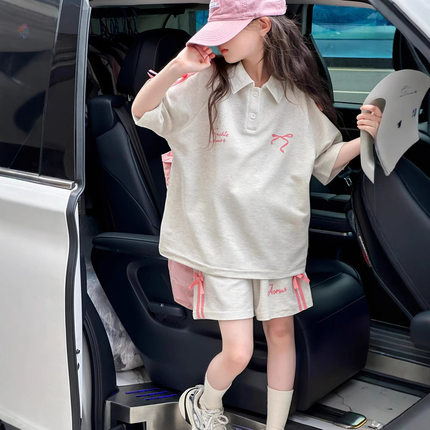 女童夏季运动套装2025新款韩版中大童蝴蝶结polo衫短袖休闲两件套