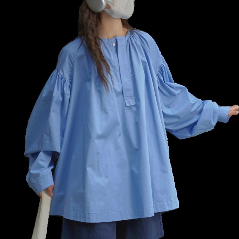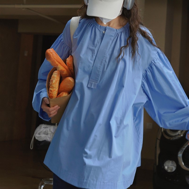 极速蓝色空气感灯笼袖衬衫秋季C新款日系圆领宽松A版上衣女