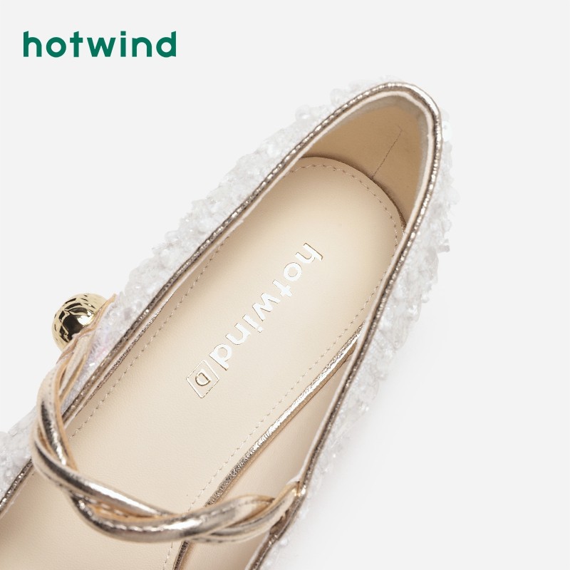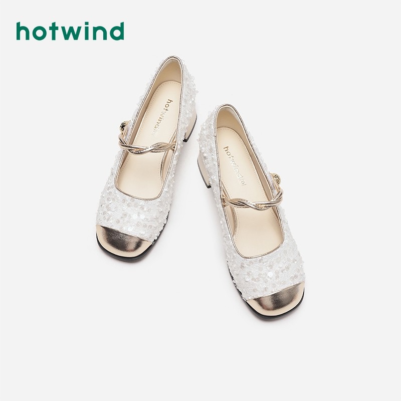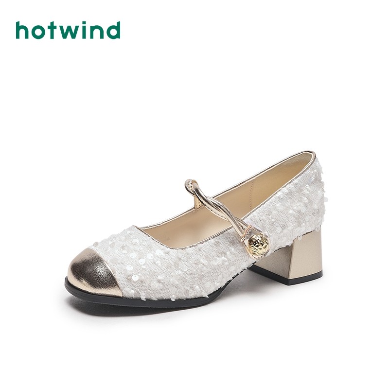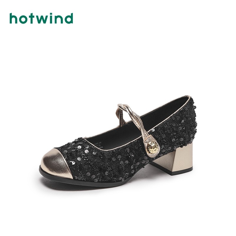 热风2024年秋季新款女士亮片拼接粗跟浅口单鞋名媛风高跟单鞋女鞋