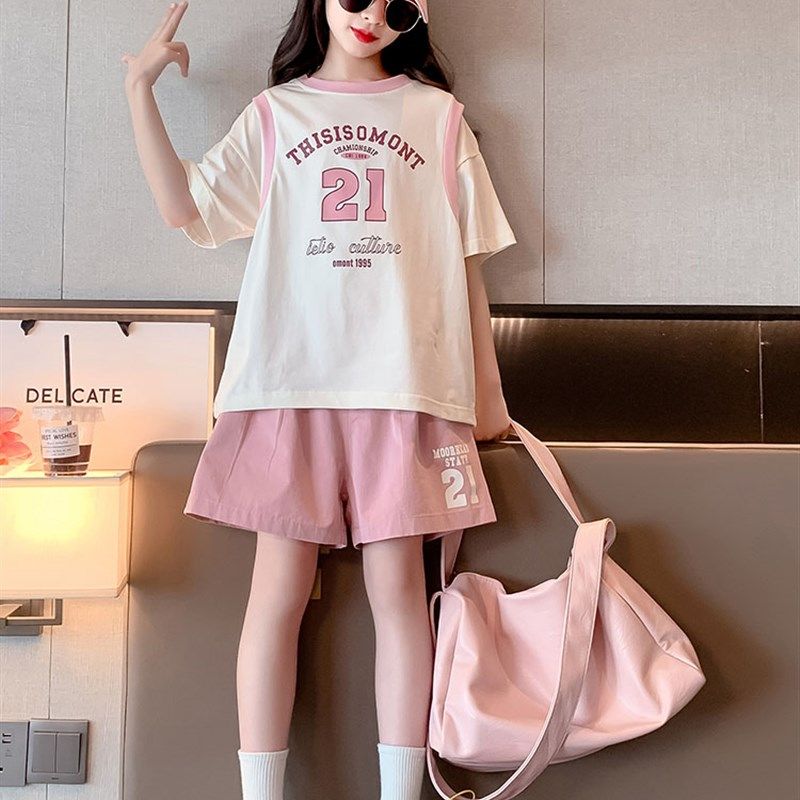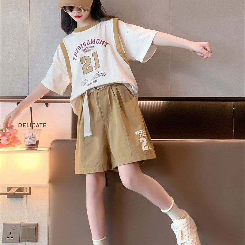 女童夏季2024新款o套装纯棉洋气儿童夏装女大童宽松运动短裤两件
