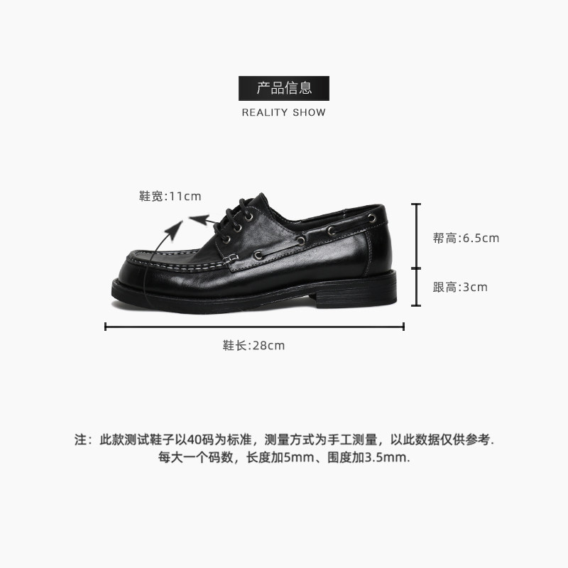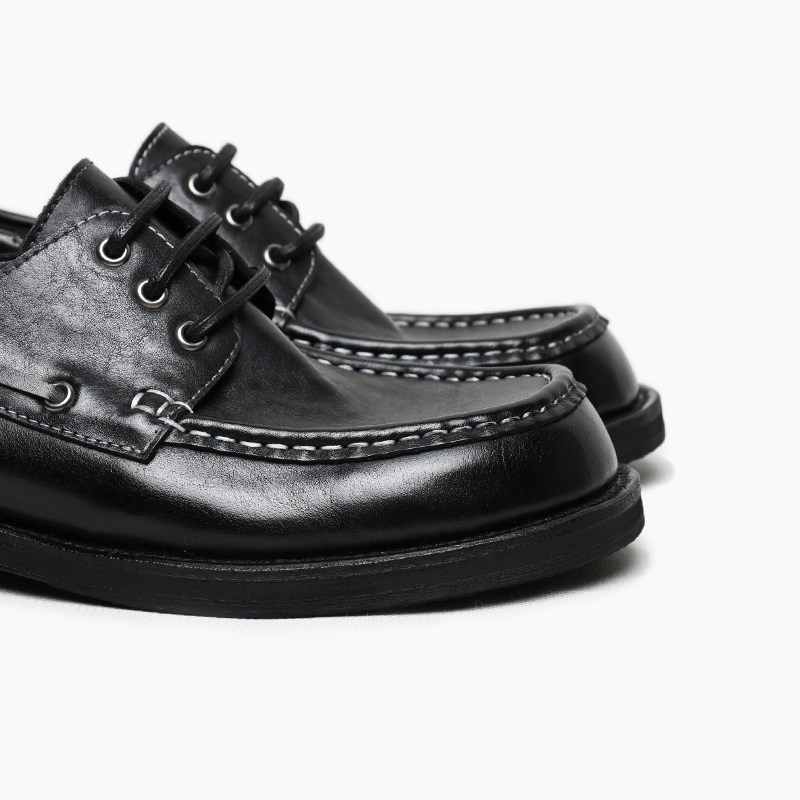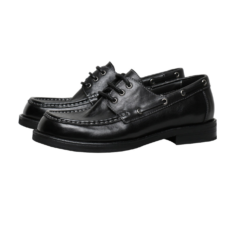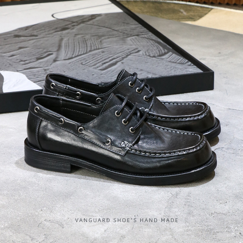 优100马皮宽版手工帆船鞋复古水洗大头浅口系带德比男休闲皮鞋黑