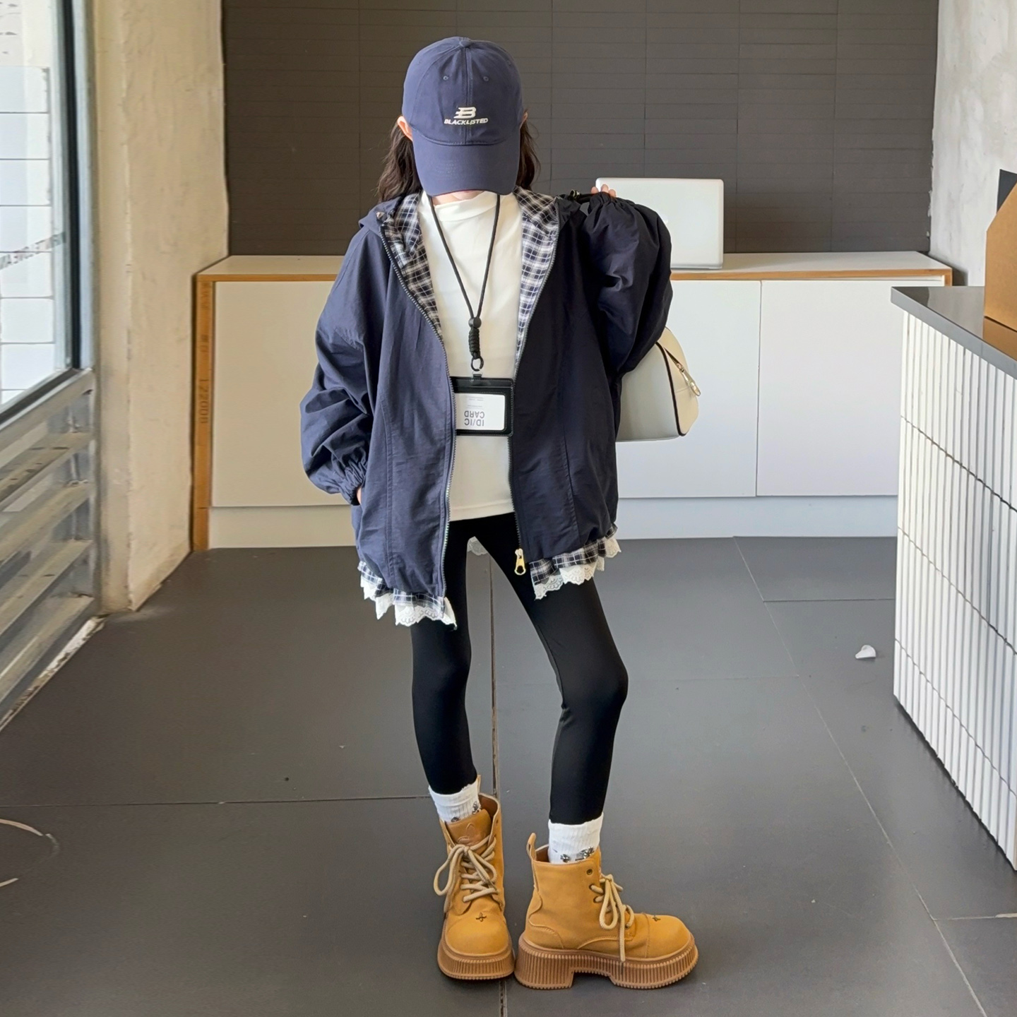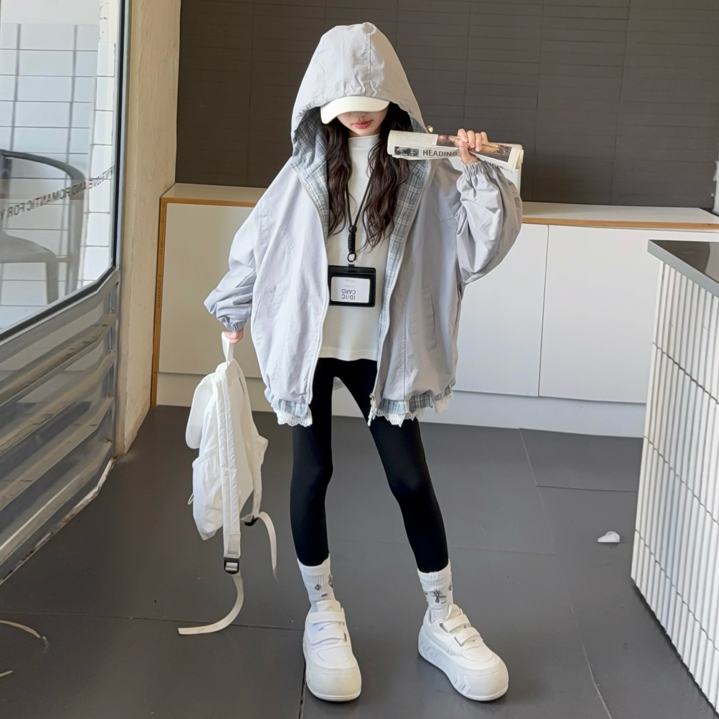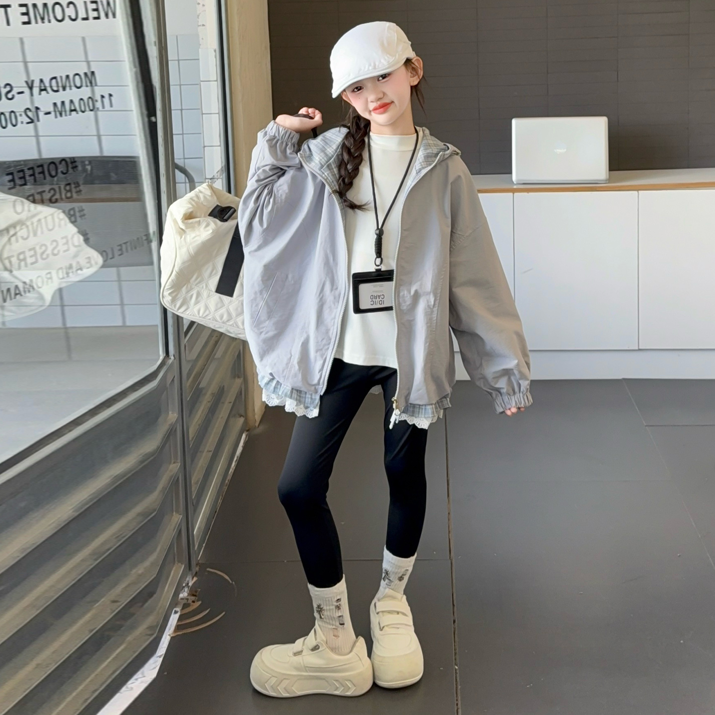 女童秋装连帽外套2025新款儿童休闲风蕾丝拼接上衣女大童春秋夹克