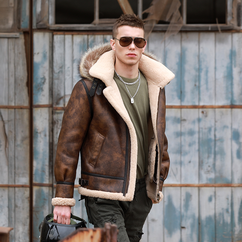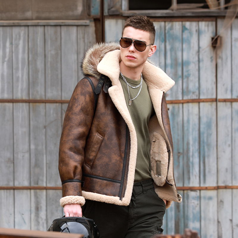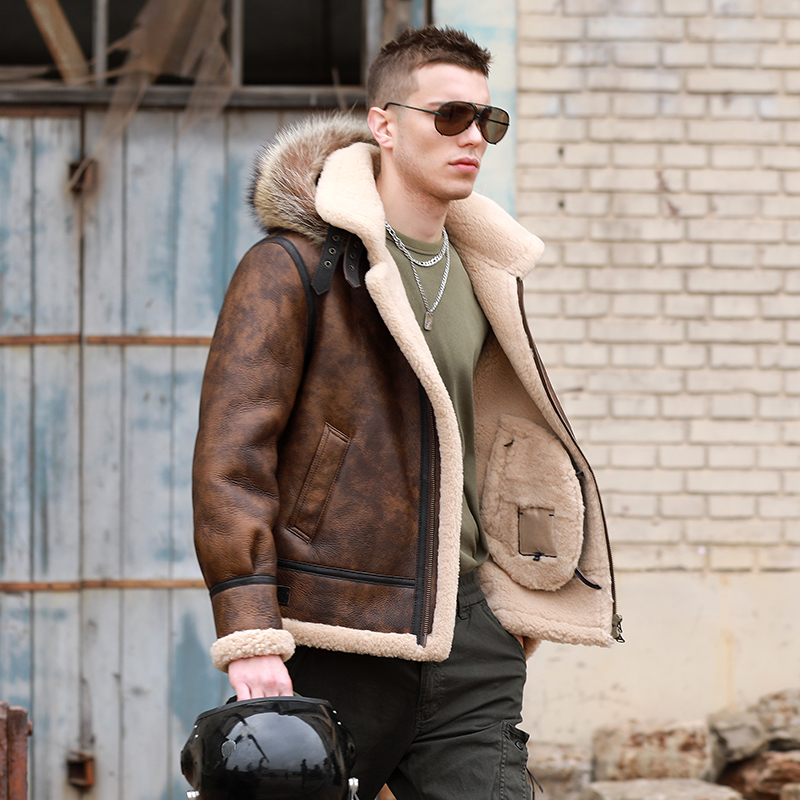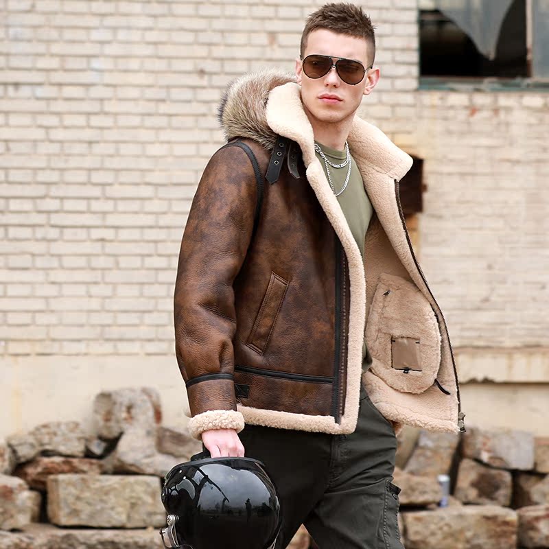 连帽原生态皮毛一体男经典厚飞行夹克冬季保暖真皮真毛羊皮毛外套