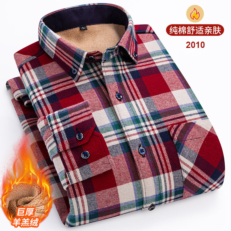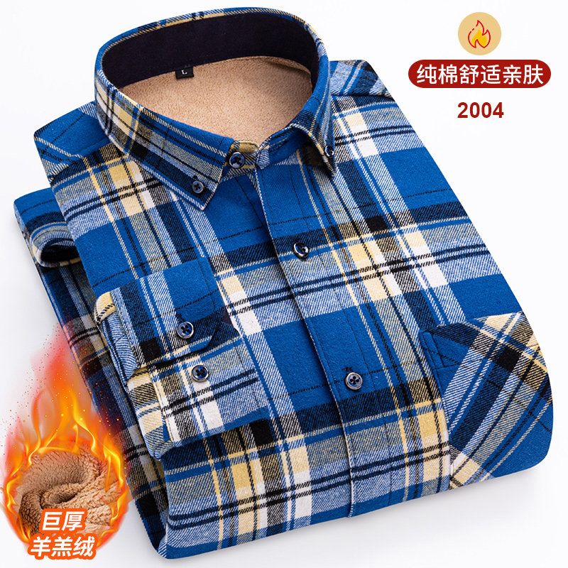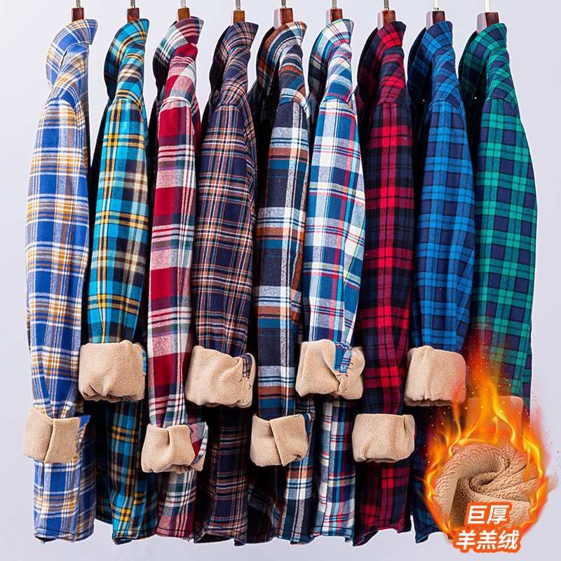 冬季纯棉磨毛加绒加厚格子长袖衬衫羊羔绒巨厚大码保暖打底衬衣男