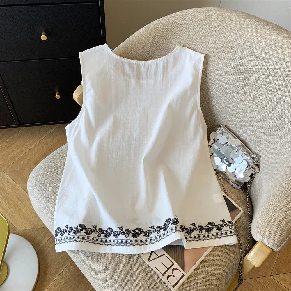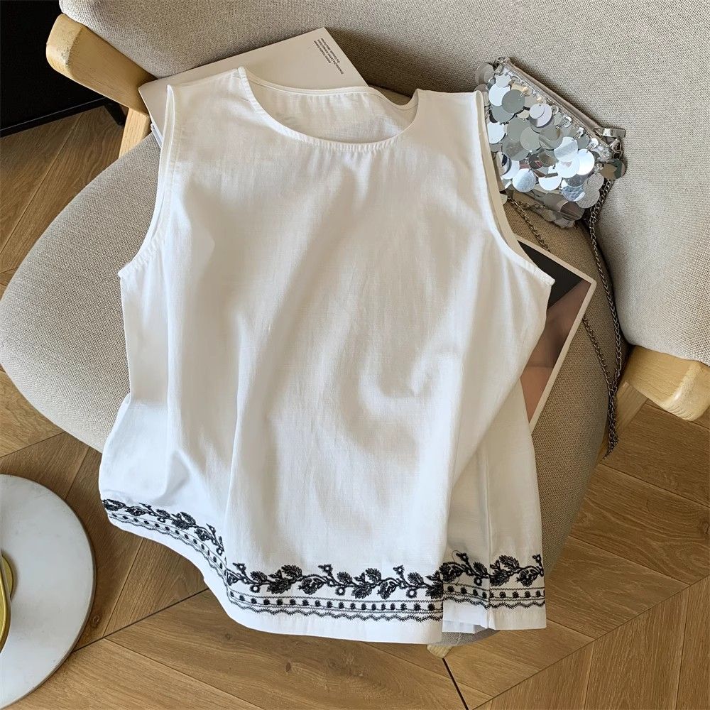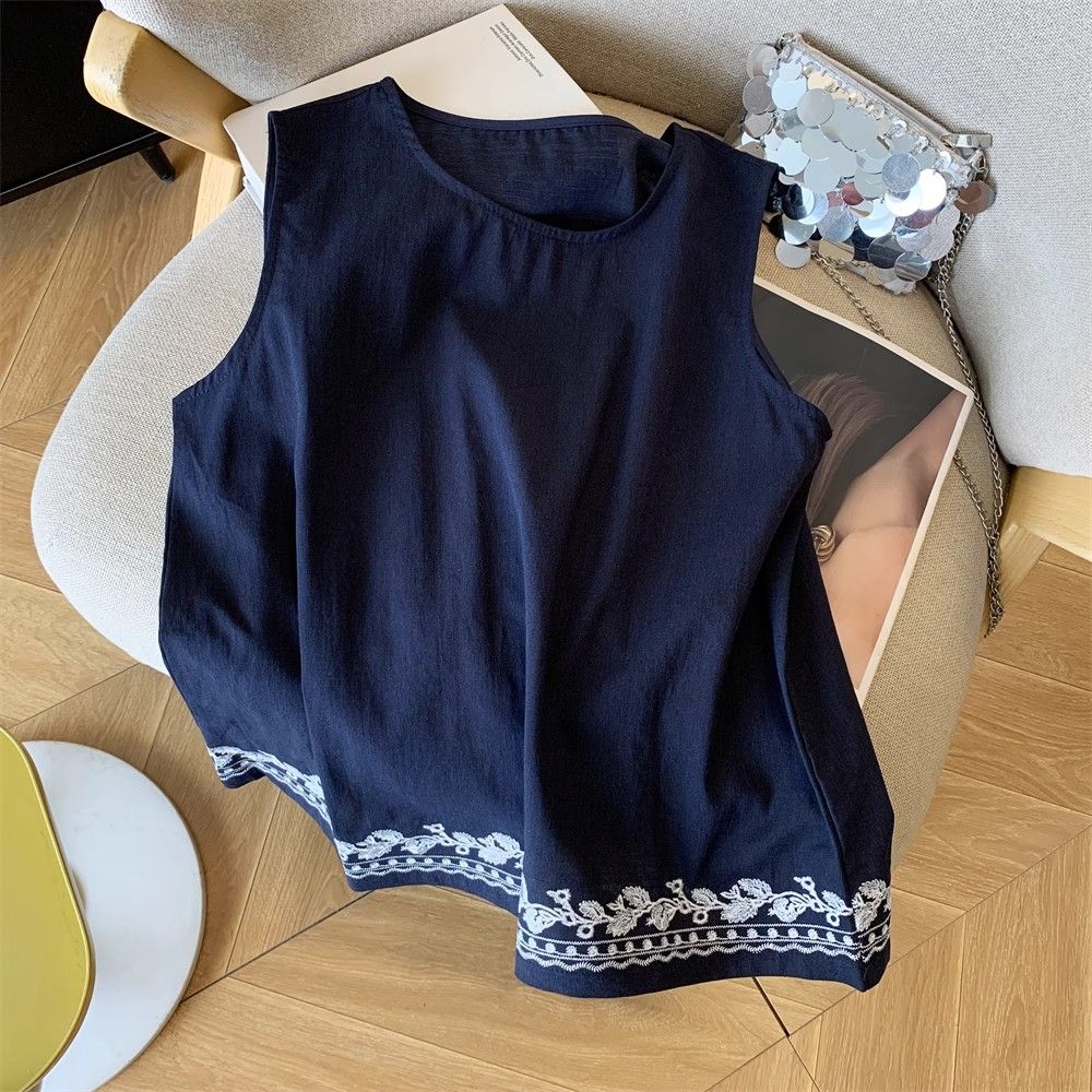 2025夏季新款内搭文艺撞色复古显瘦无袖圆领刺绣棉麻背心女装上衣