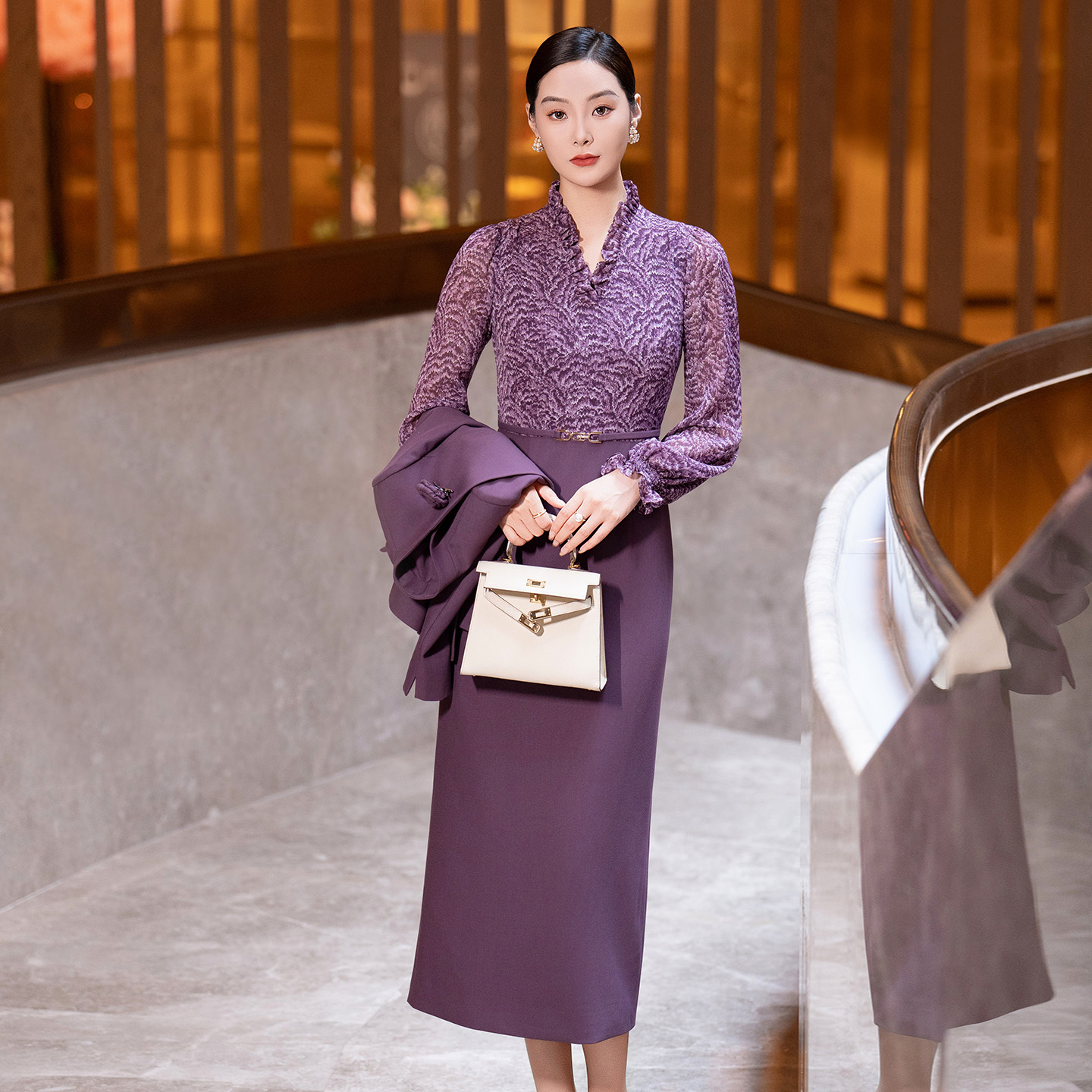 紫色毛呢套装女2025秋季新款高档西装外套气质修身连衣裙两件套裙
