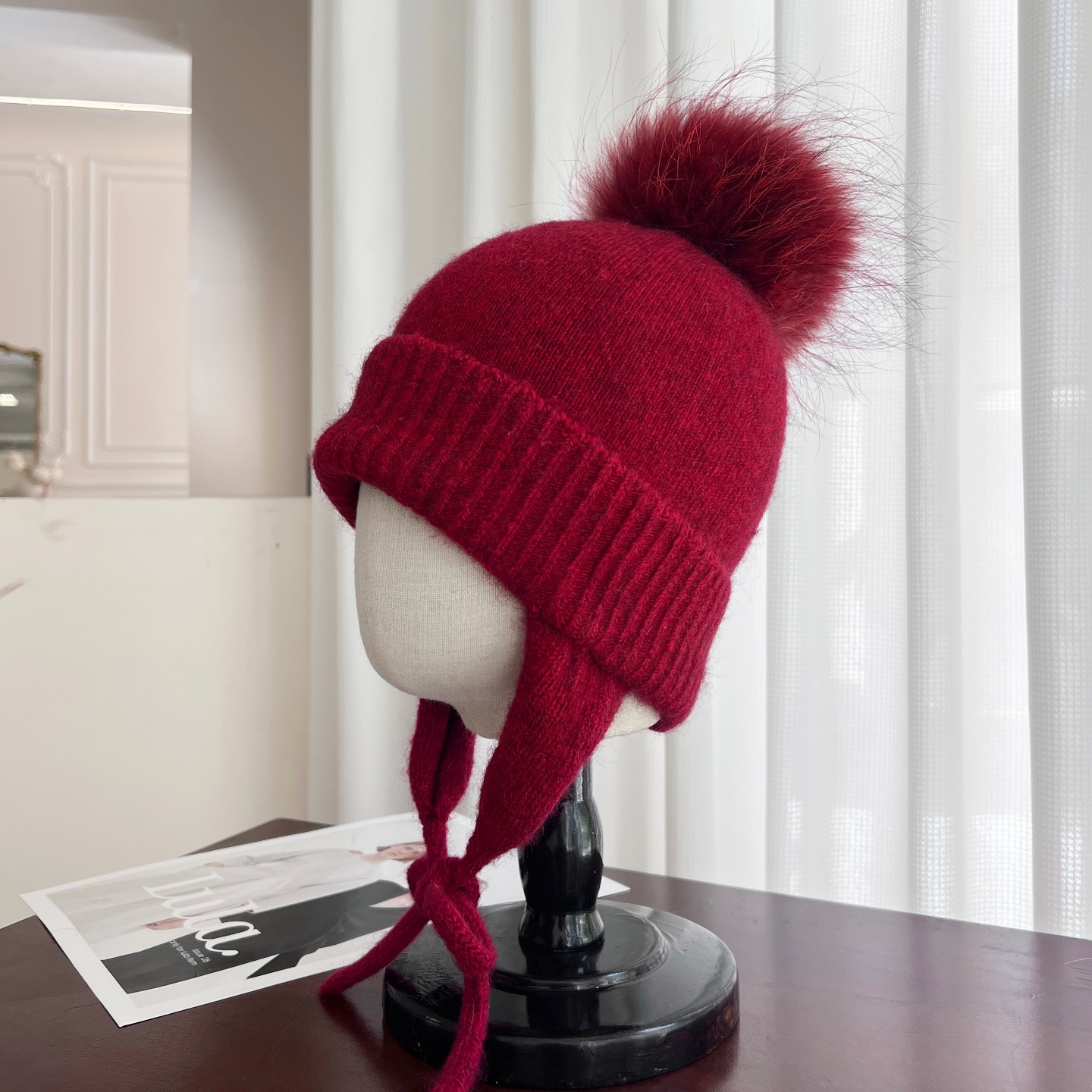 2025山羊绒针织帽子女冬季时尚保暖毛线帽狐狸毛球防寒护耳包头帽
