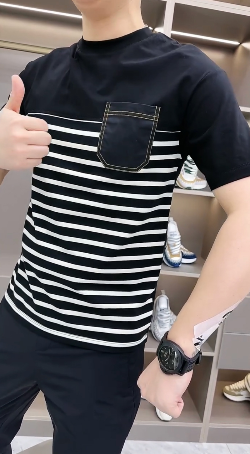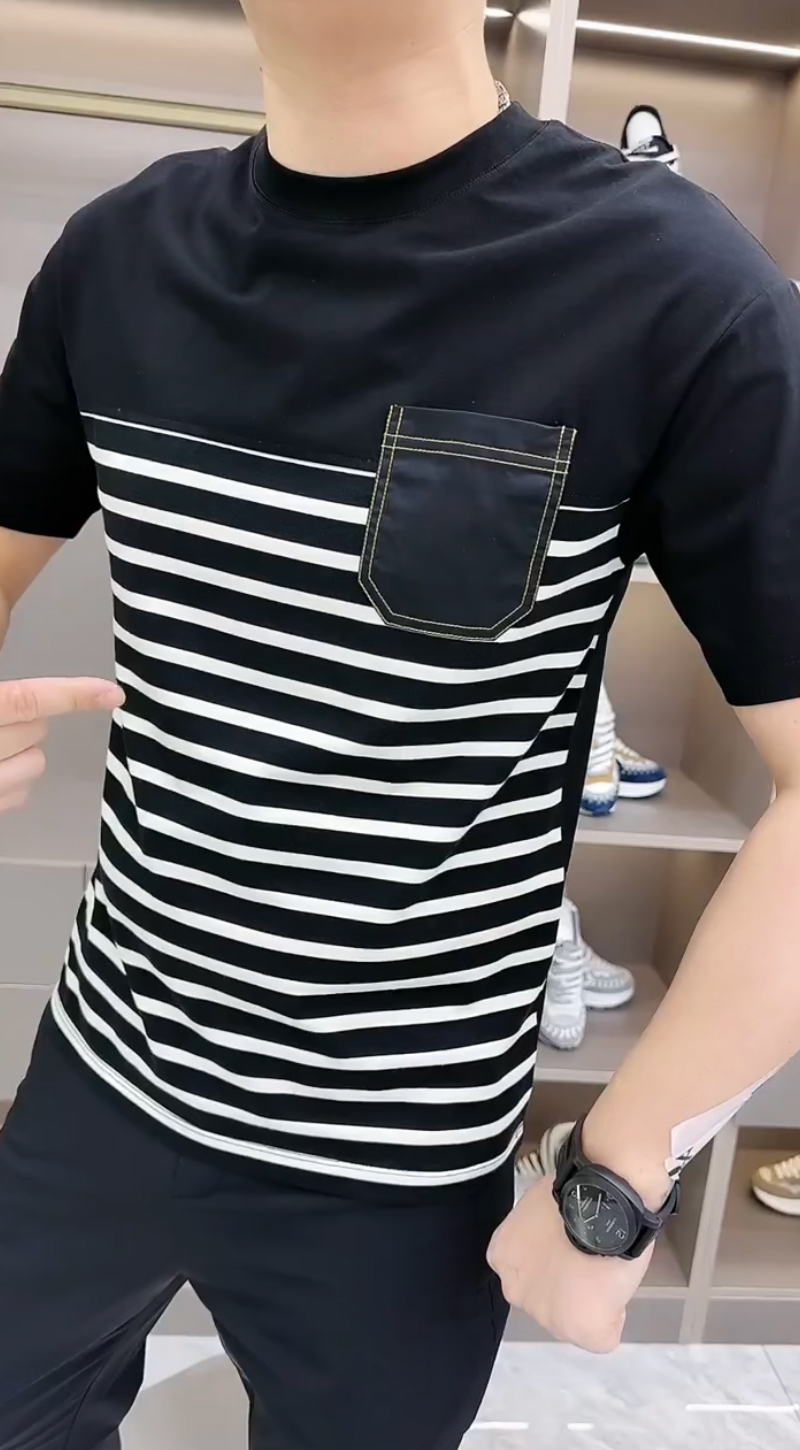 BXBM2025夏季新款潮流时尚拼接半袖男士条纹圆领舒适T恤青年短袖