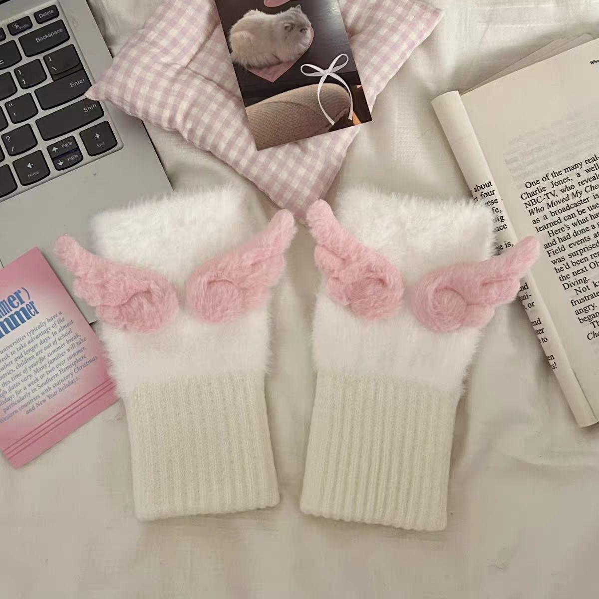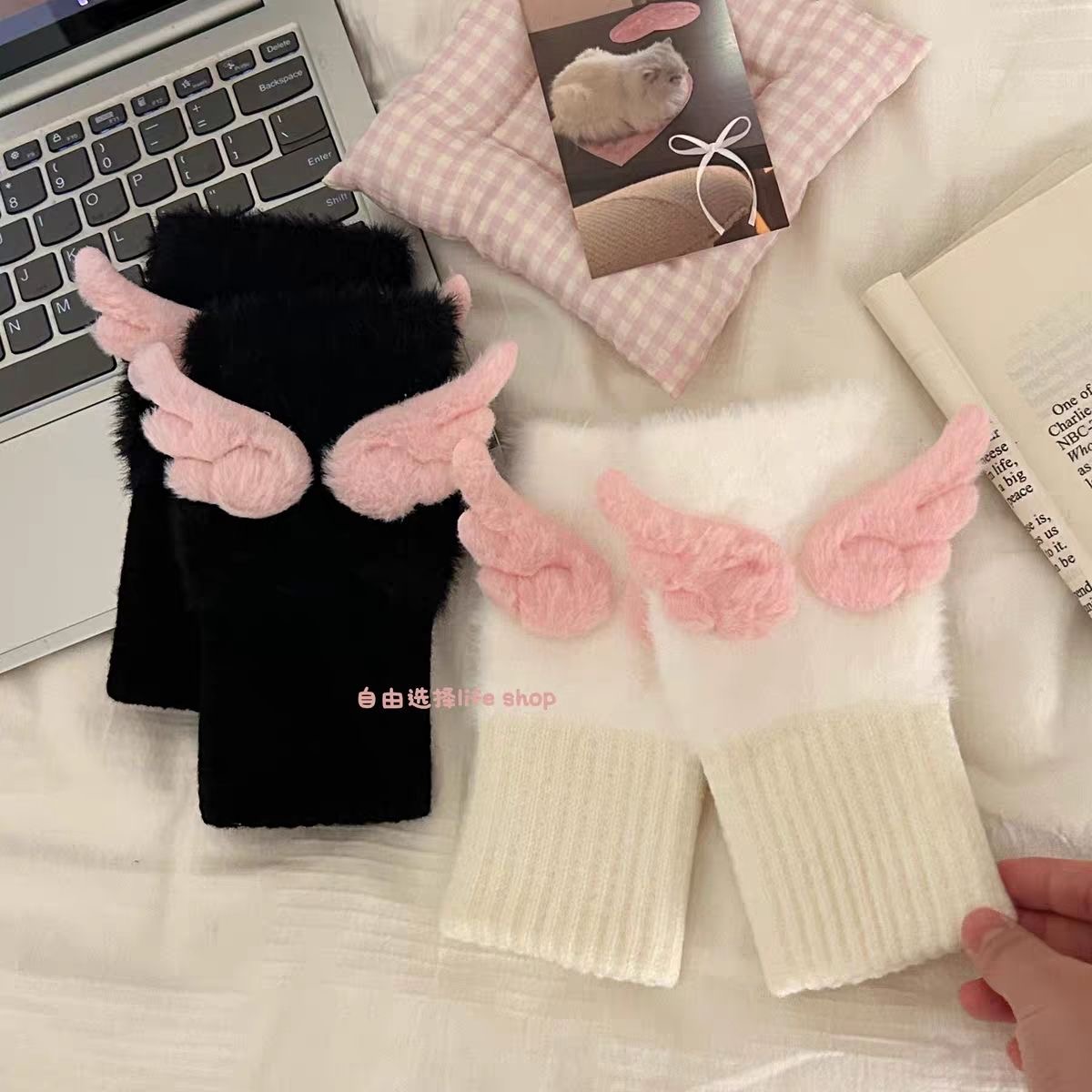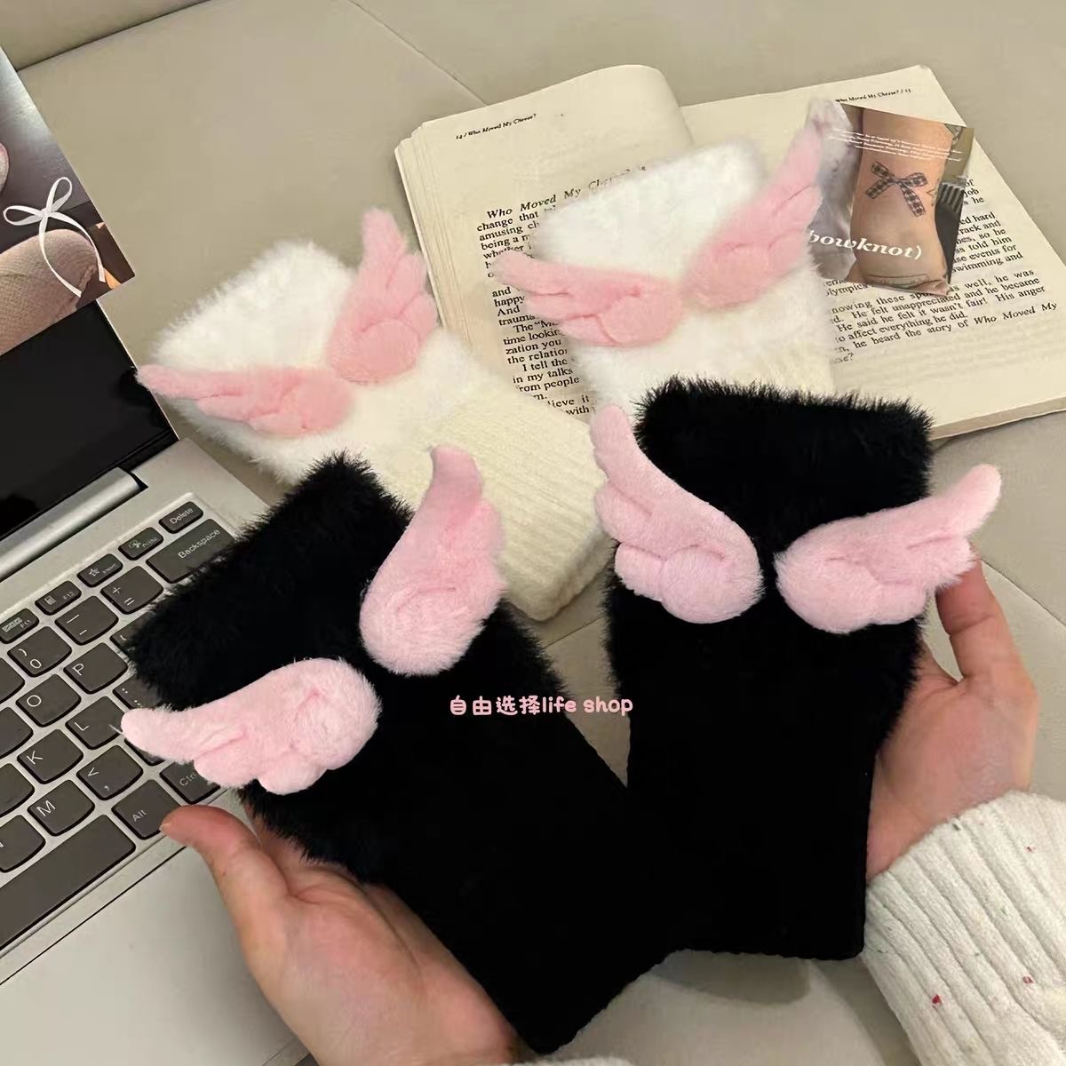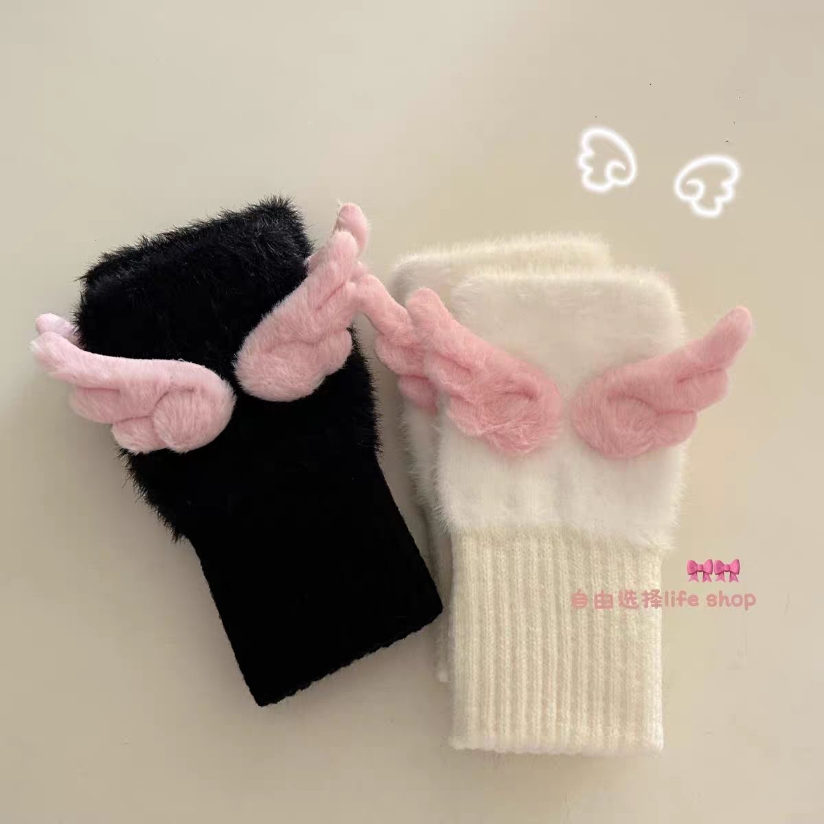 可爱少女心半指手套秋冬季毛绒绒防寒保暖可触屏天使翅膀手套百搭