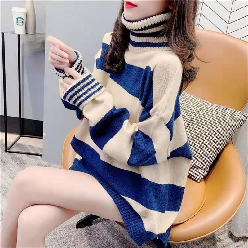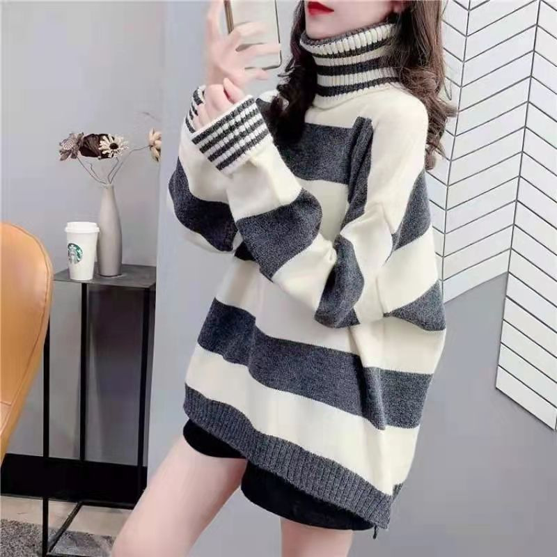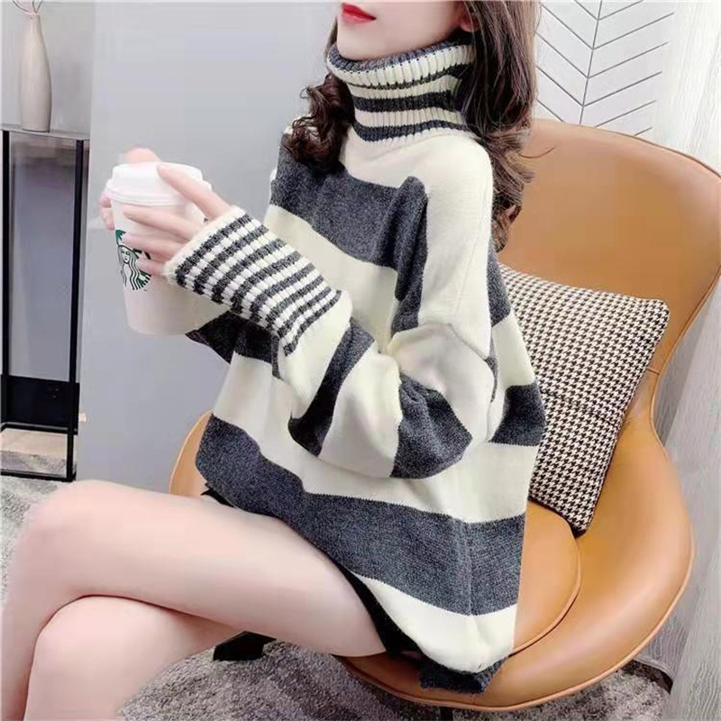 2023秋冬女士新款条纹毛衣女宽松复古风高领百搭横条针织衫