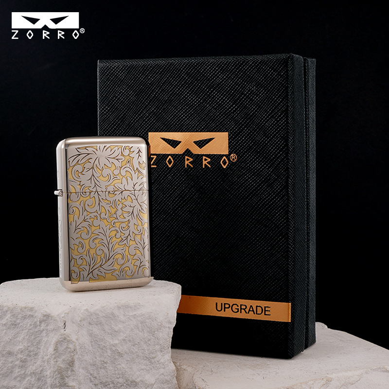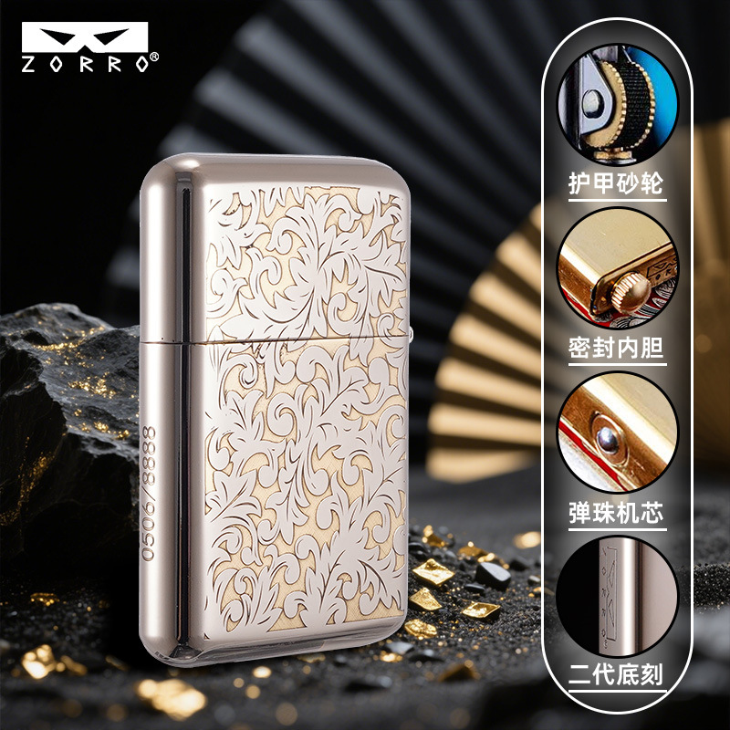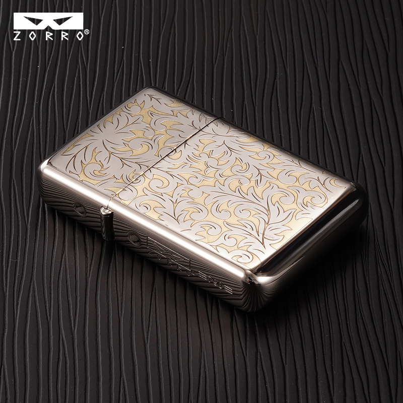 zorro佐罗正品砂轮煤油打火机铜壳子银色圆三代雕刻唐草花纹图腾