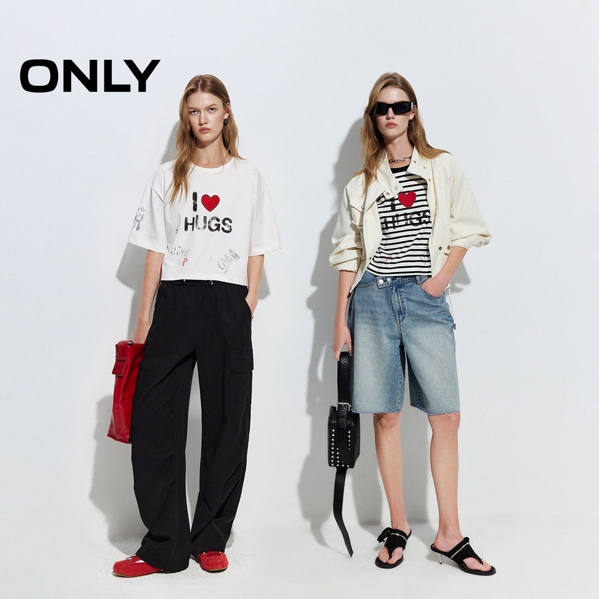 ONLY2025夏季新款精致爱心刺绣复古印花落肩圆领短款宽松T恤女