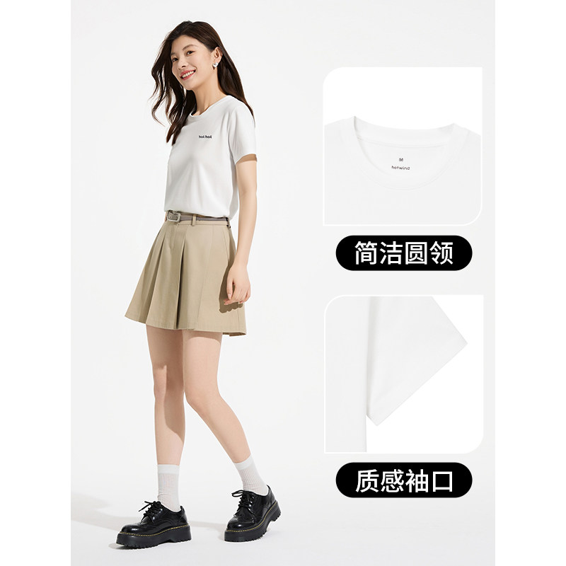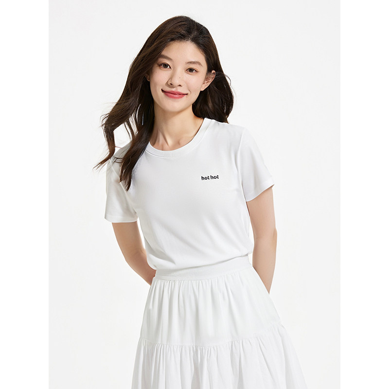 热风女士短袖T恤上衣2025年夏季新款简约小字母绣花白色短袖上衣T