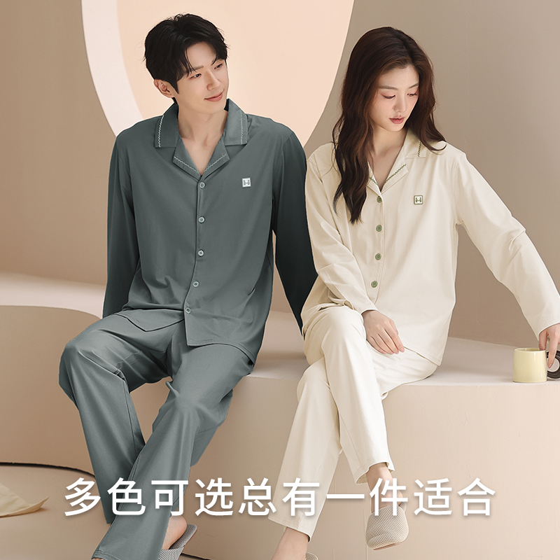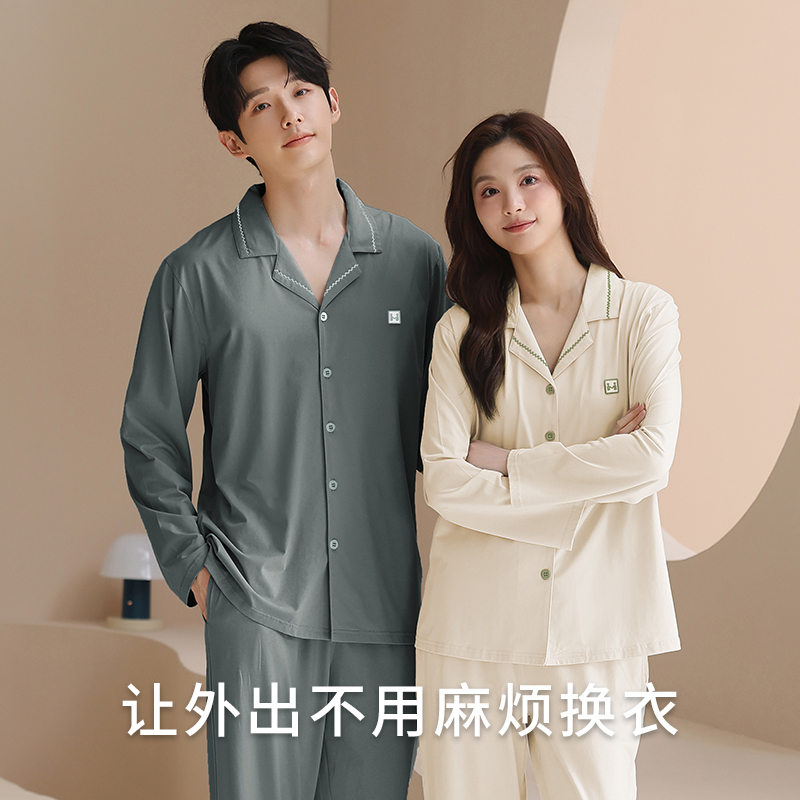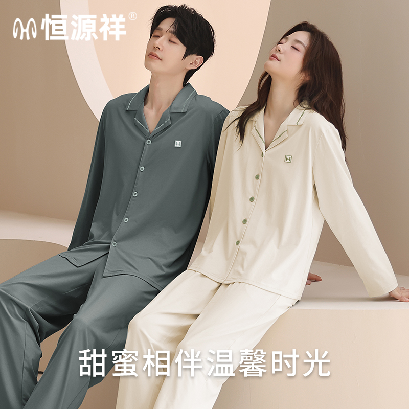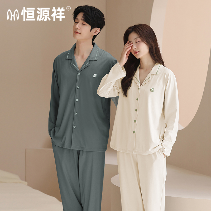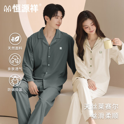 恒源祥情侣睡衣天丝莱赛尔7A抑菌防螨翻领休闲可外穿家居服套装