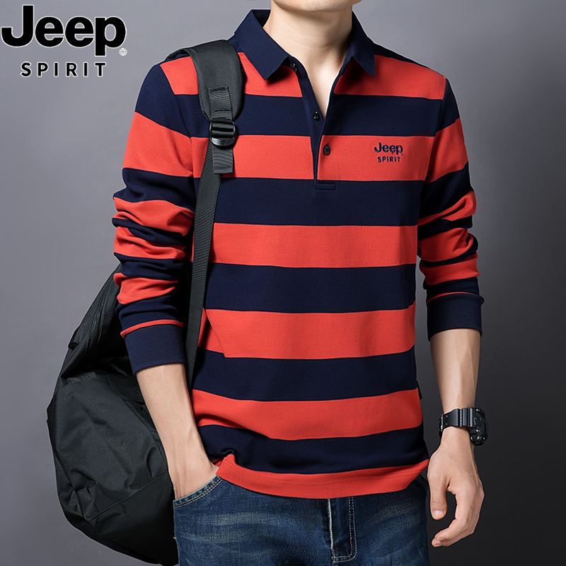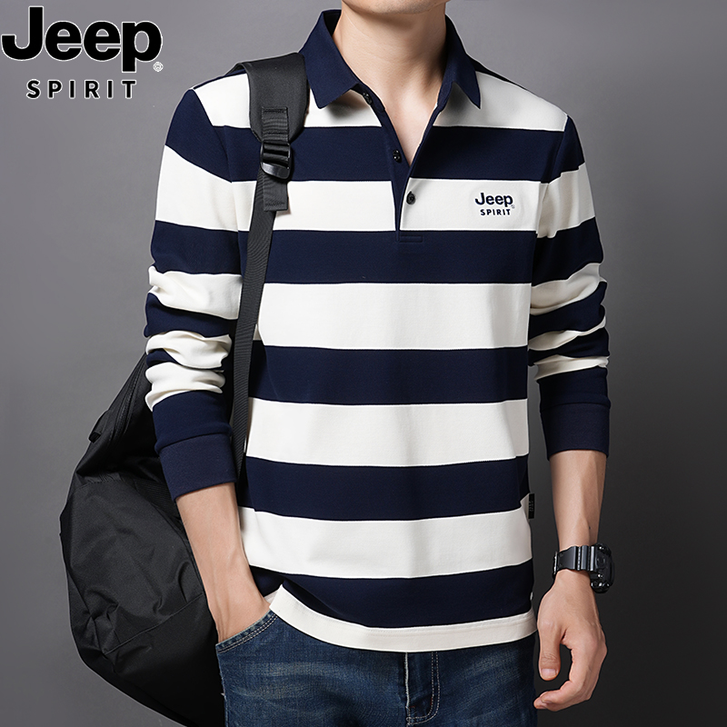 吉普纯棉长袖t恤男士2025新款春秋季休闲polo衫条纹打底衫上衣男