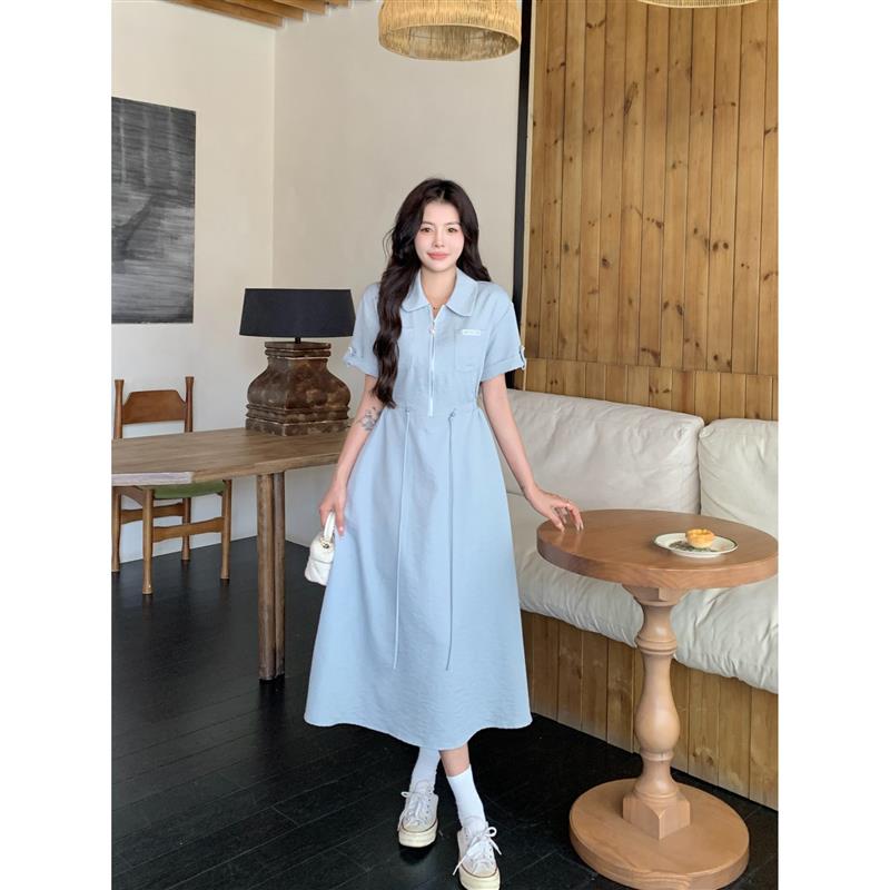 大码微胖女生连衣裙女夏季休闲衬衫裙子胖mm遮肚显瘦复古a字长裙