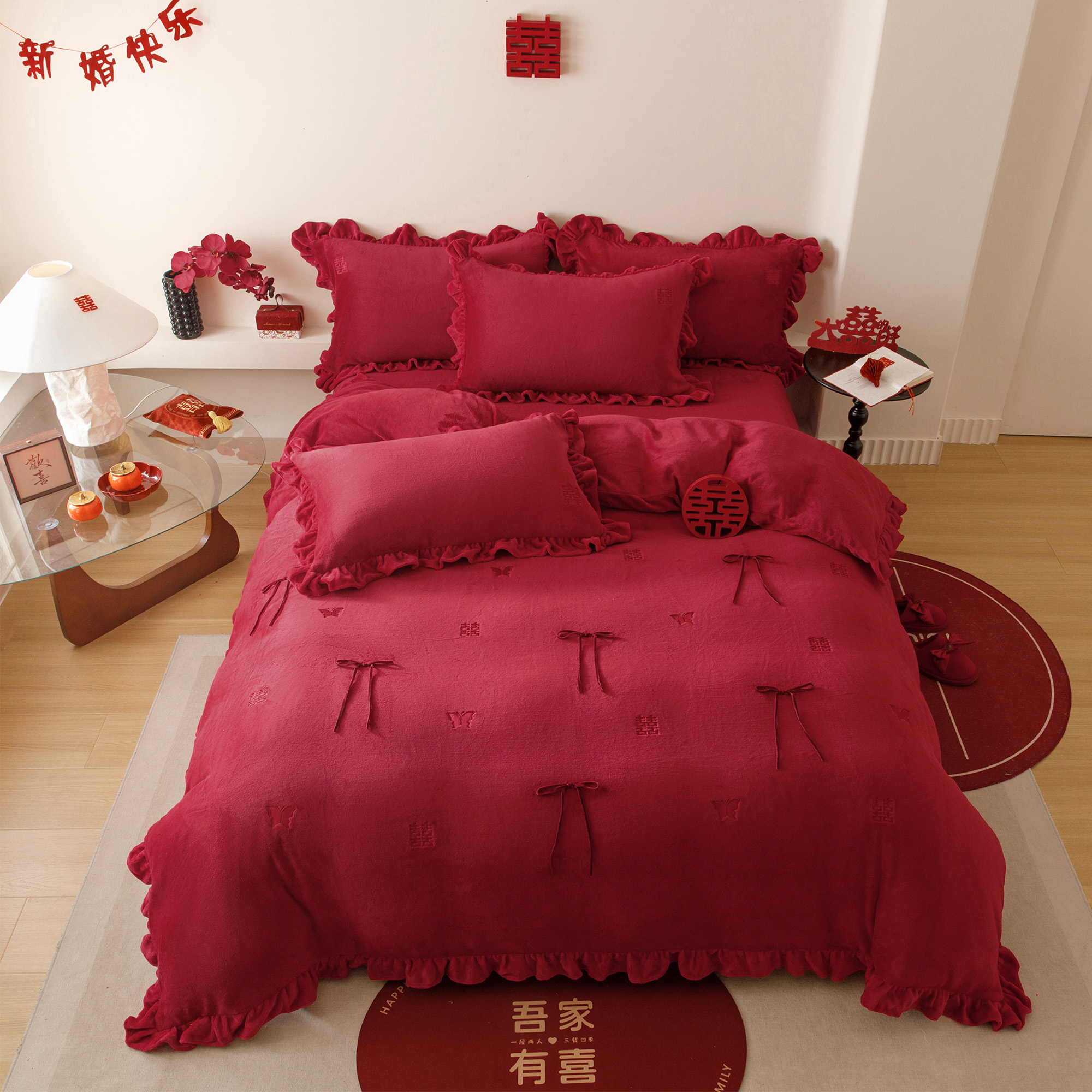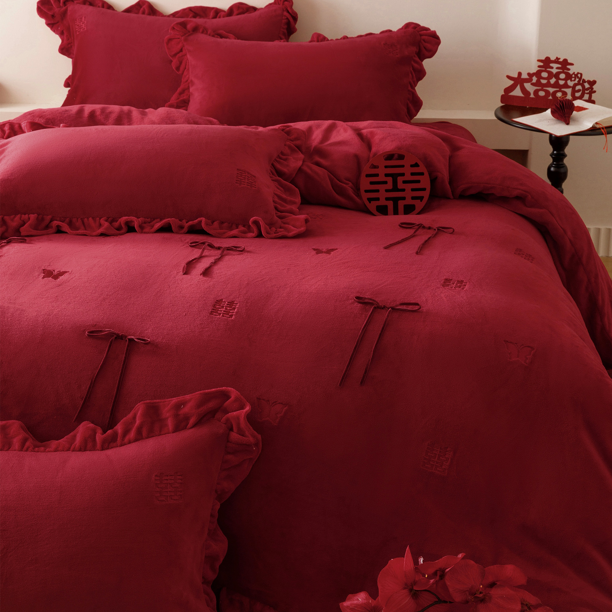 冬天加厚牛奶绒婚庆四件套喜字刺绣蝴蝶结保暖红色结婚被套床单