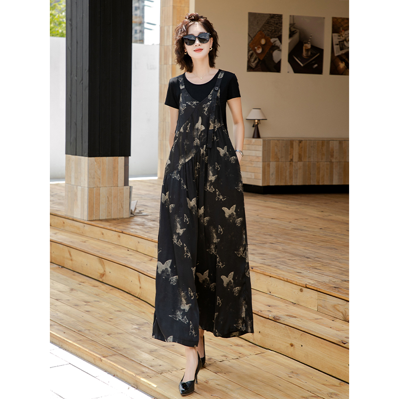 高端印花天丝背带裤女2025夏季新款洋气减龄宽松显瘦连体裤阔腿裤